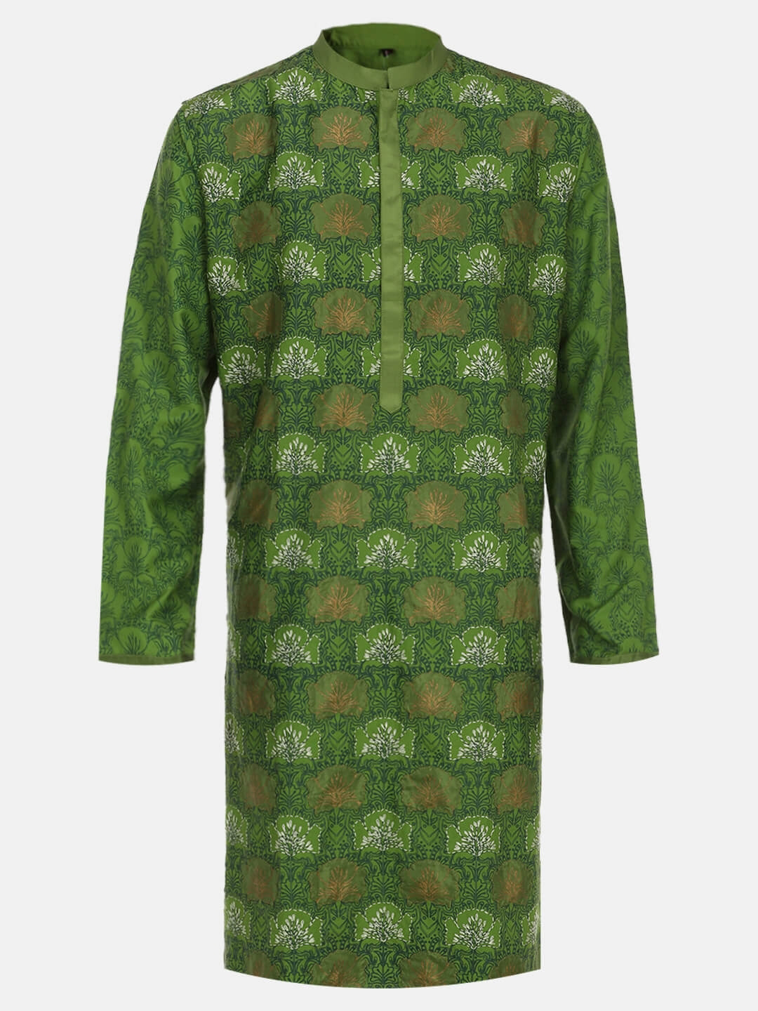 Olive green printed joysree silk panjabi with appliqued and embroidery. Features in-seam pockets. Pair with pajama, waistcoat and other accessories.
