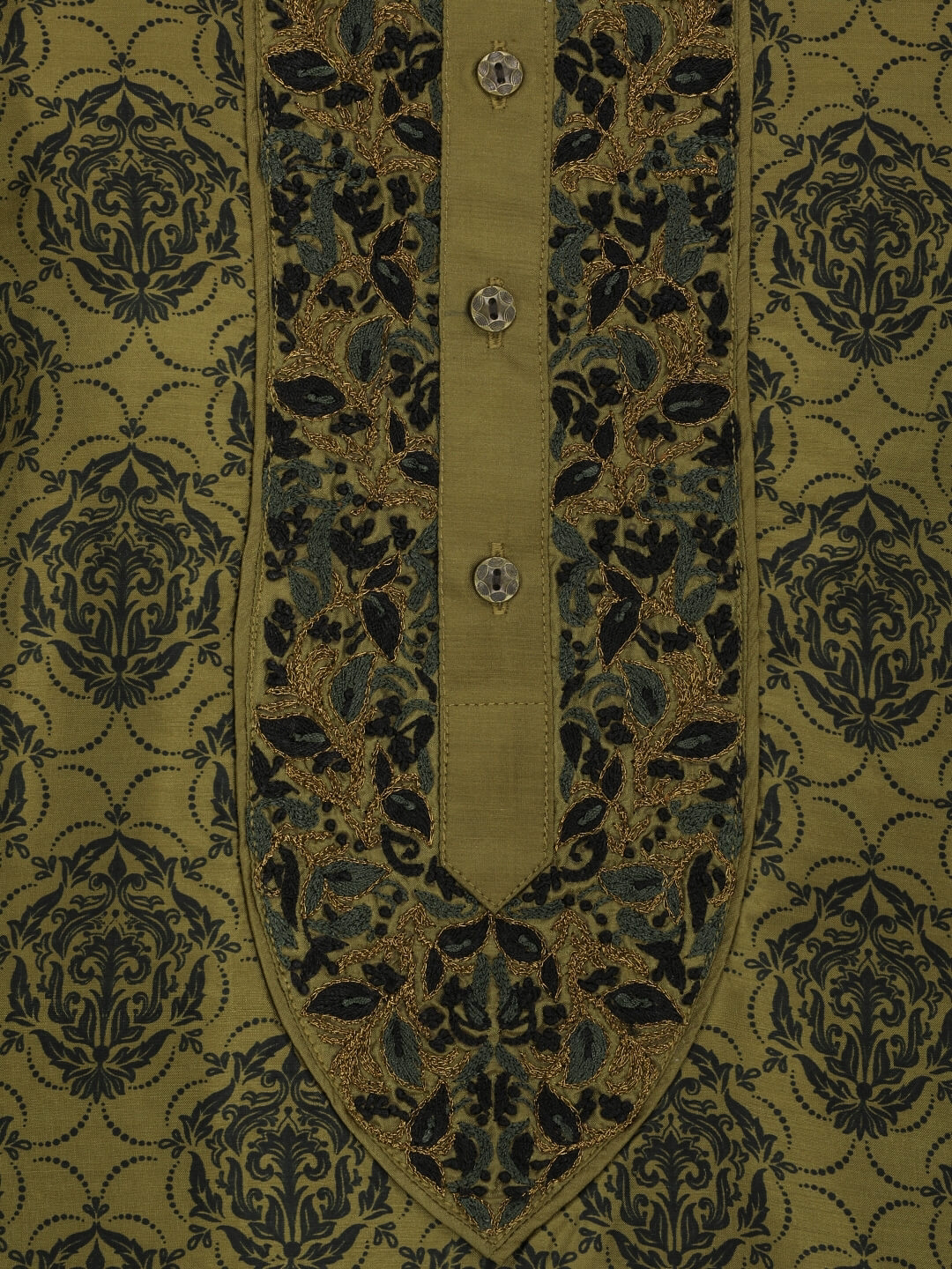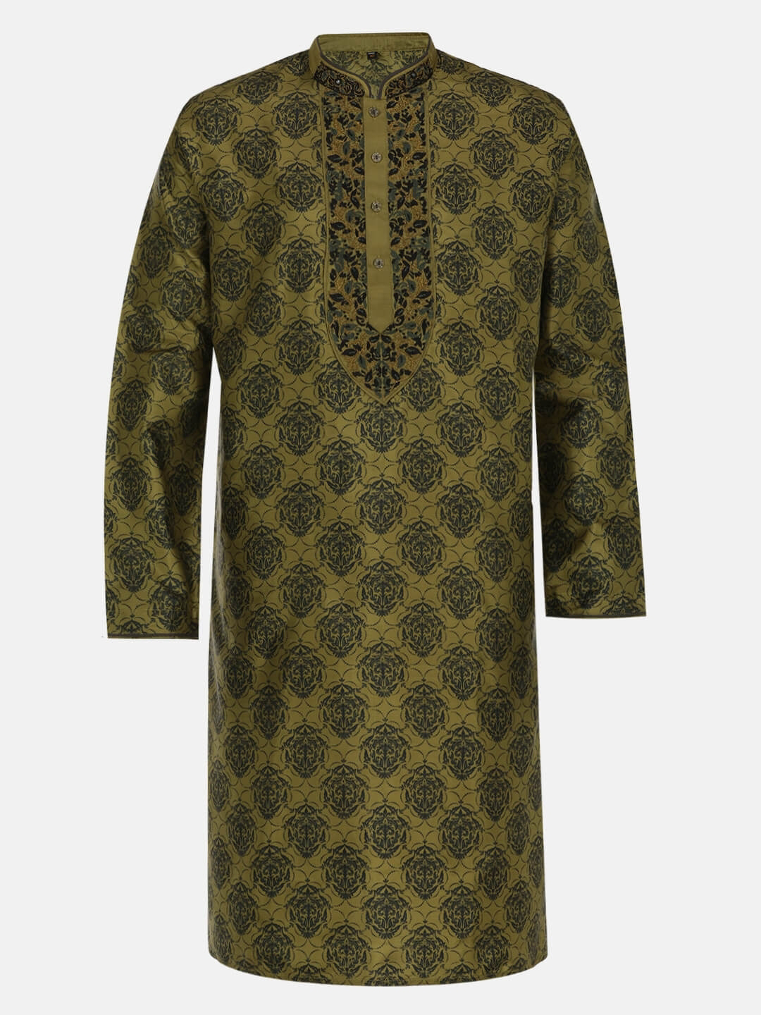 Olive green printed silk panjabi with erri embroidery and in-seam side pockets. Comes with white cotton pajama.