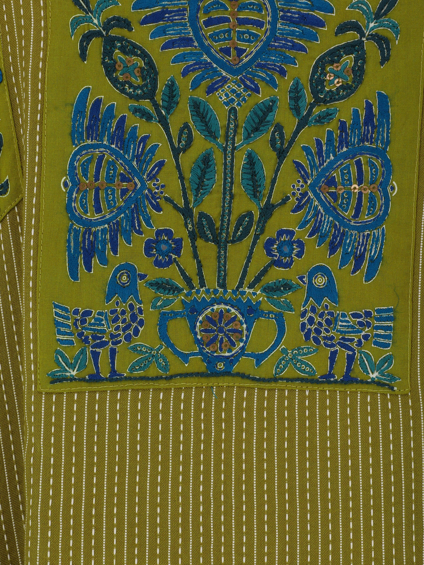 Olive kurta with printed voile patch with shades of blue and teal embroidery.