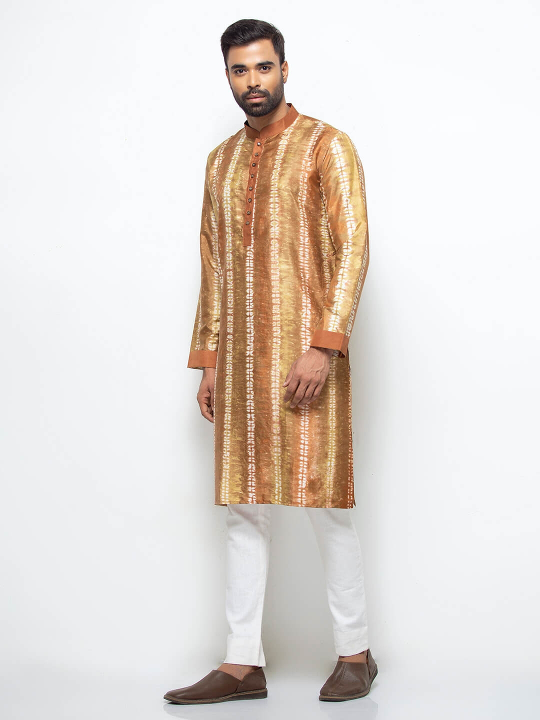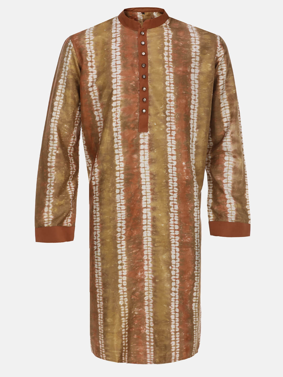 Olive, brown and white tie-dyeing silk panjabi. Features in-seam side pockets. Pair with pajama, waistcoat and other accessories.