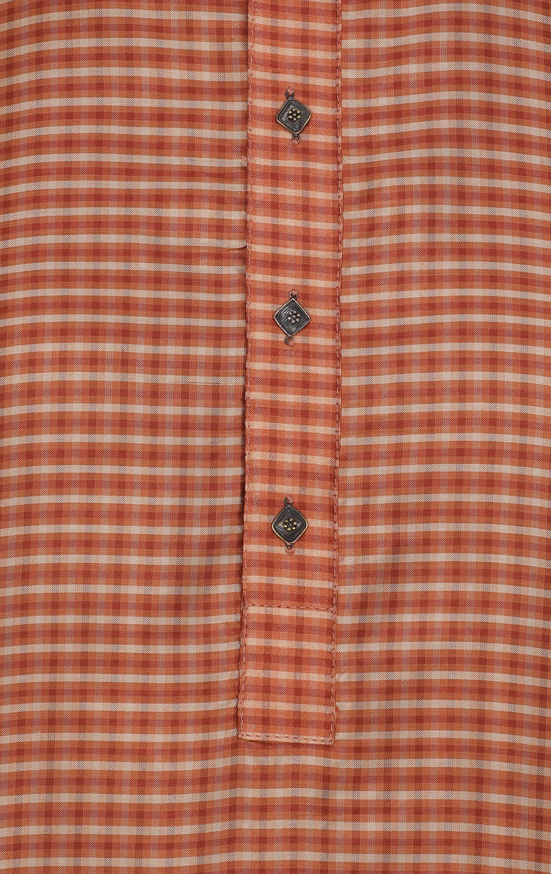 Orange check silk panjabi with erri embroidery over neckline. Comes with brown viscose-cotton pajama.