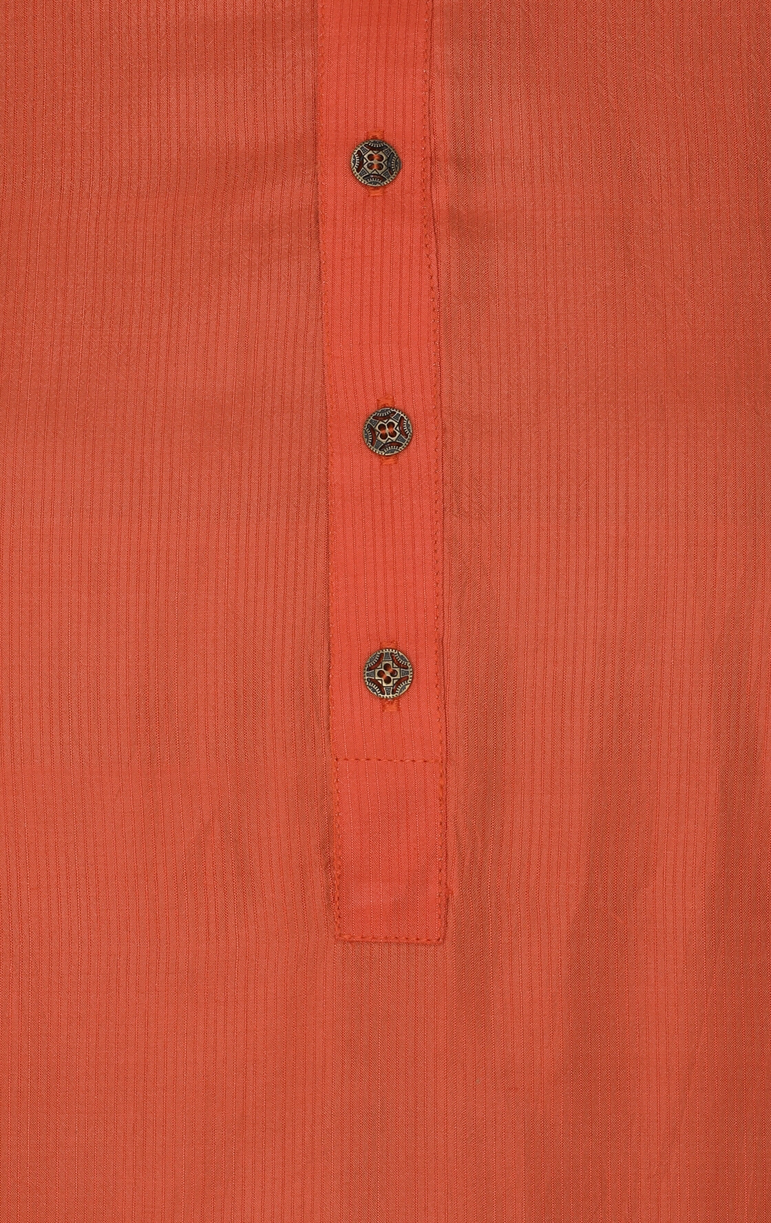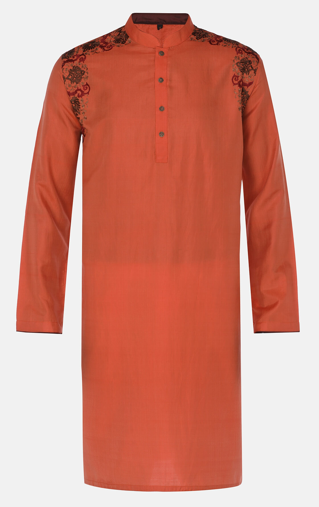 Orange silk-cotton panjabi with embroidery and dual side in-seam pockets. A white viscose-cotton pajama with drawstring and elastic waist comes in this set. Embroidery work is completed with brown and maroon thread.