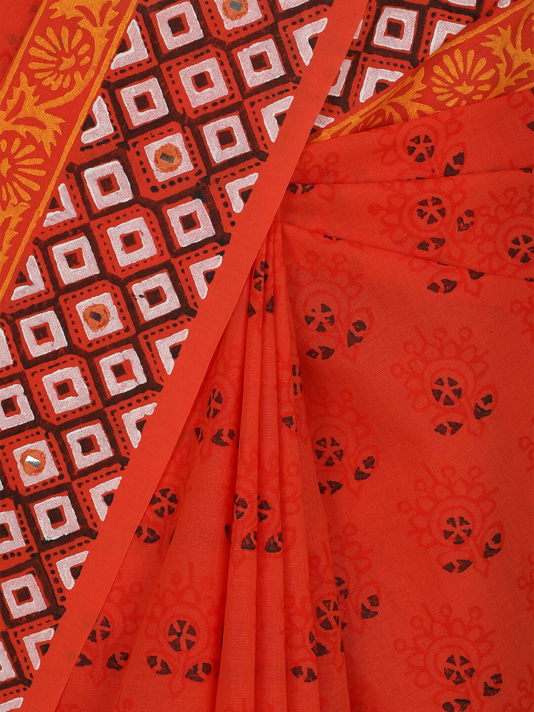 Orange cotton saree with multicolour prints. Comes with tassel trimmed aanchal and matching unstitched blouse piece.