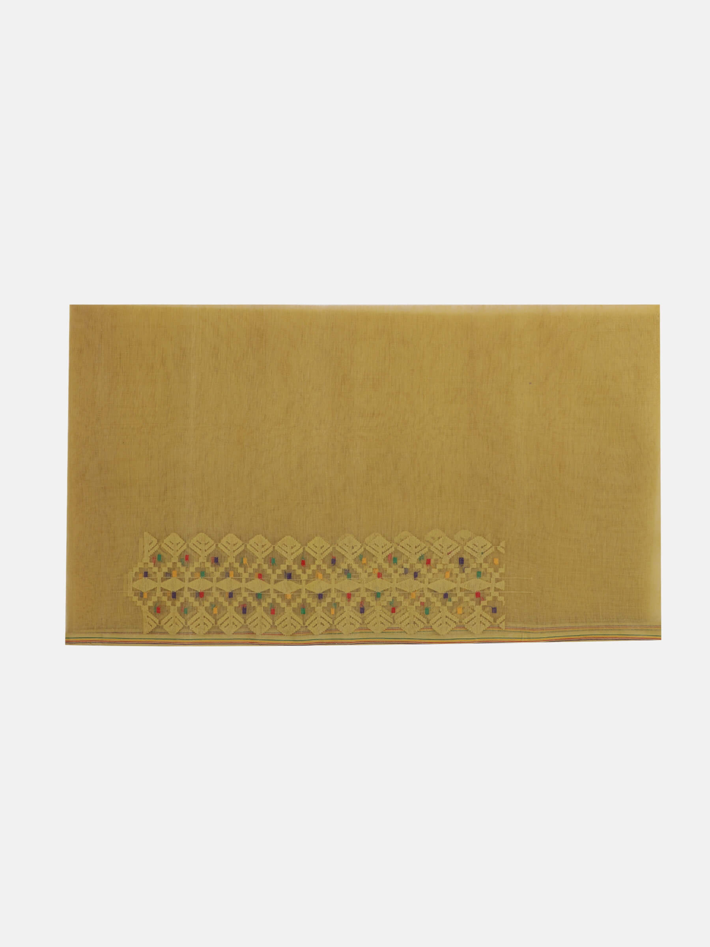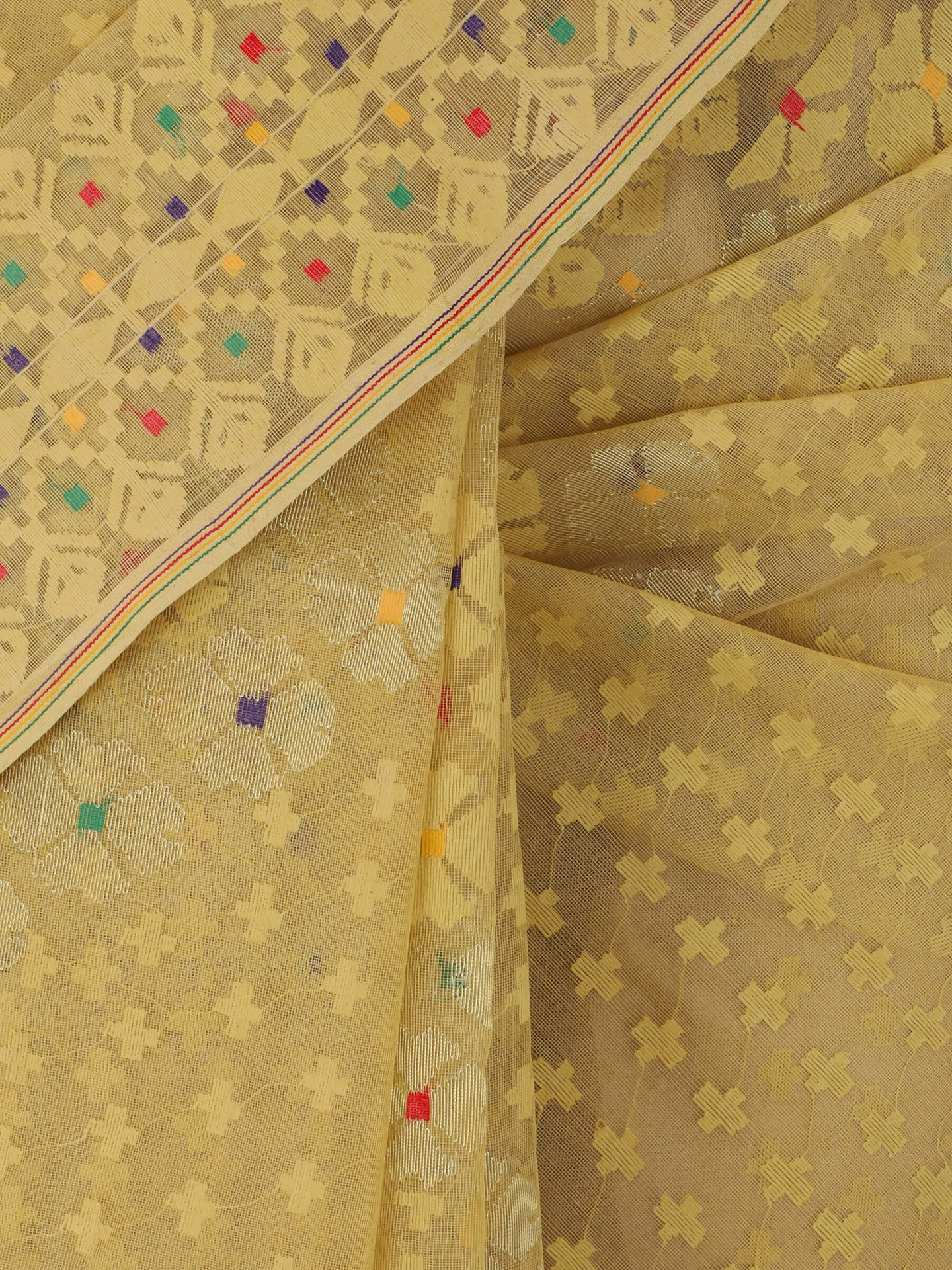 Pastel yellow half silk jamdani saree with multicolour buti. Comes with unstitched blouse piece.