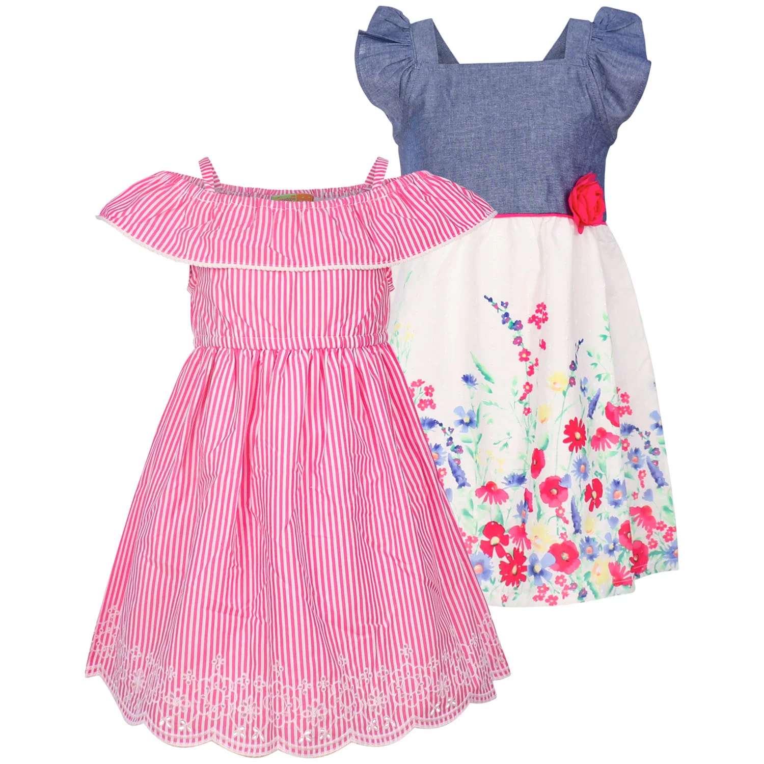 Fiber Content- Pink Eyelet/Border Floral- Dress 1- 55% Cotton 45% Polyester, Dress 2- 100% Cotton