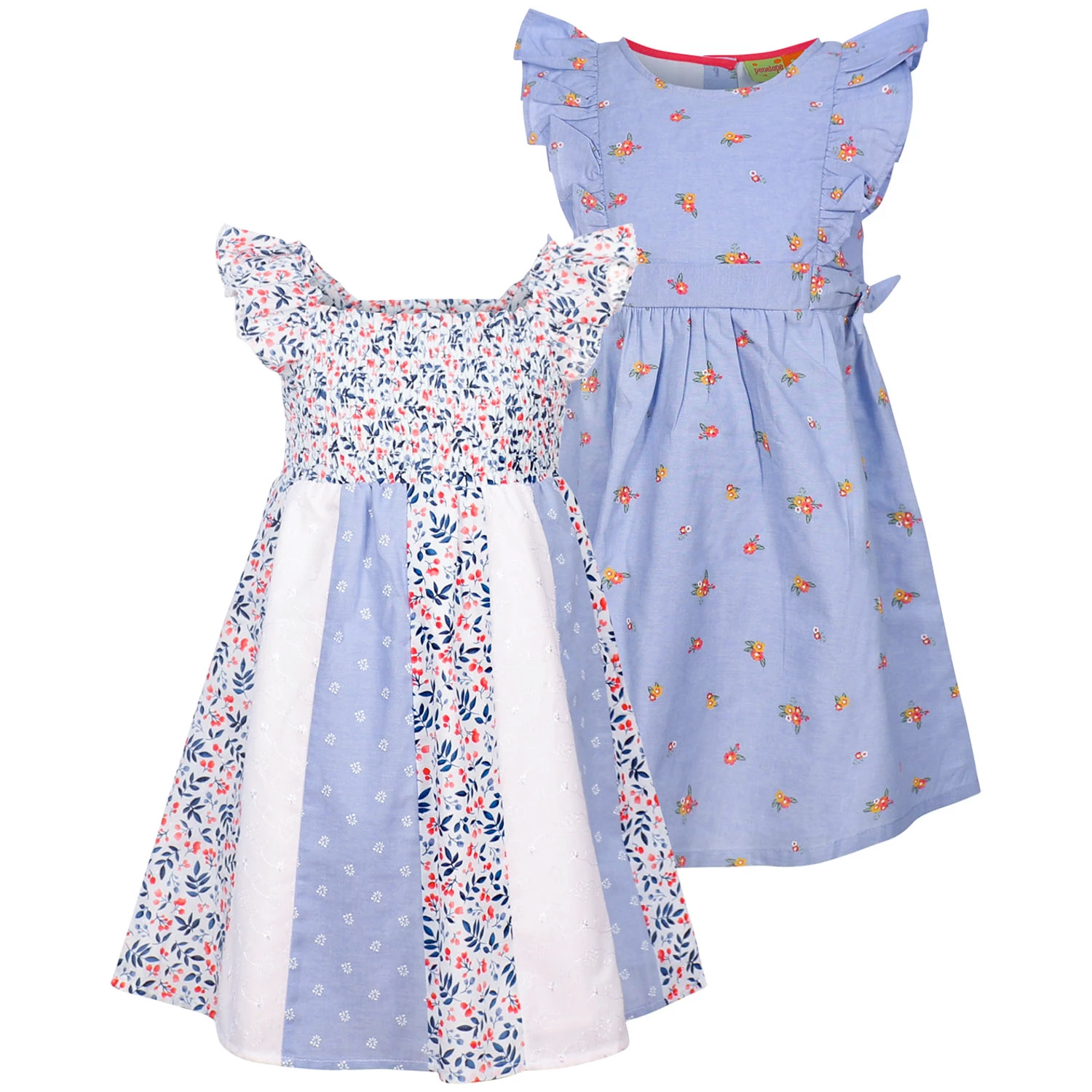 Fiber Content- Floral Eyelet/Floral Chambray- Dress 1- 100% Cotton Embroidered fabric 55% Cotton 45% Polyester, Dress 2- 100% Cotton