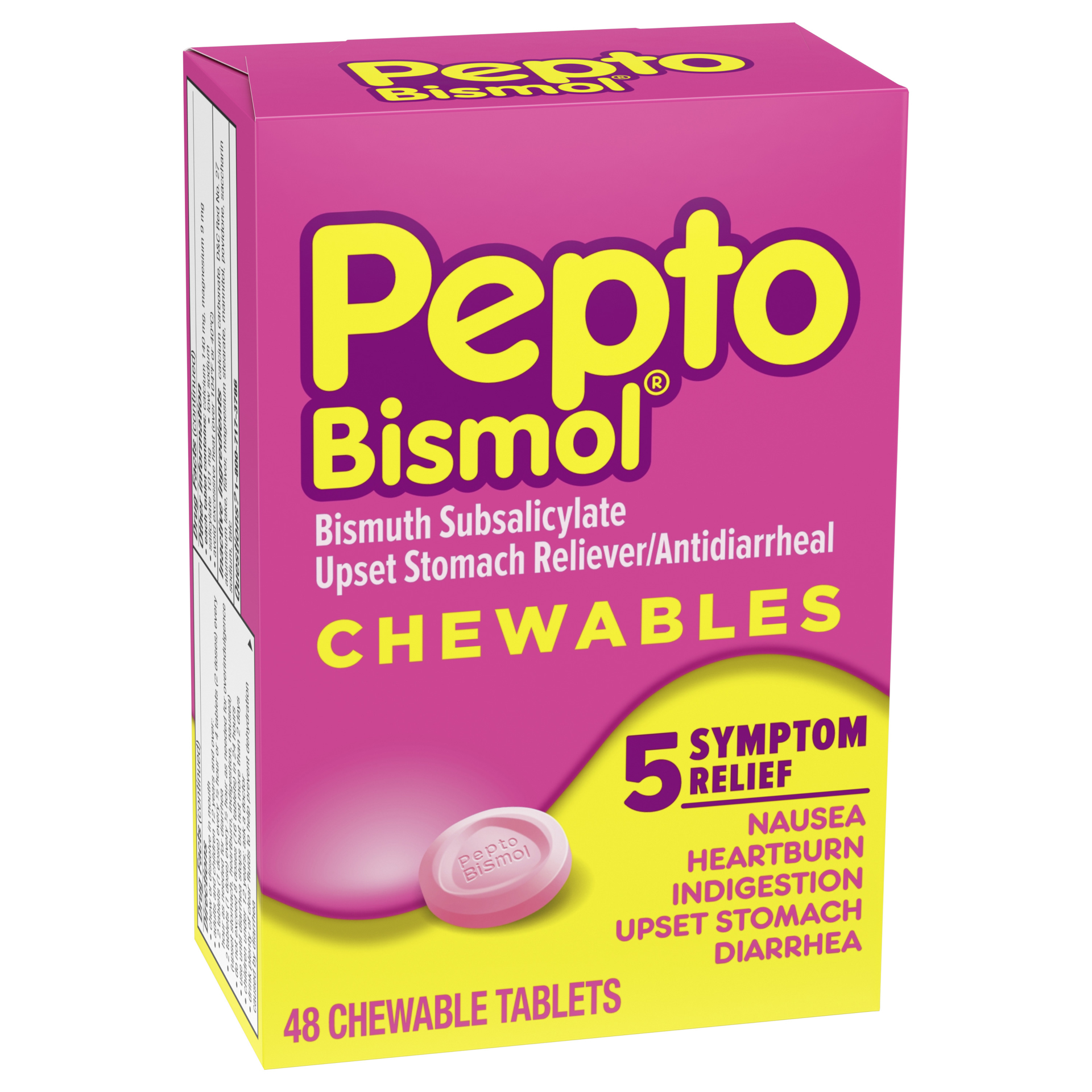 Pepto Bismol Original Chewable Tablets. When you have a sour stomach, Pepto's coating action calms and soothes your symptoms, providing fast digestive relief from nausea, heartburn, indigestion, upset stomach, and diarrhea.