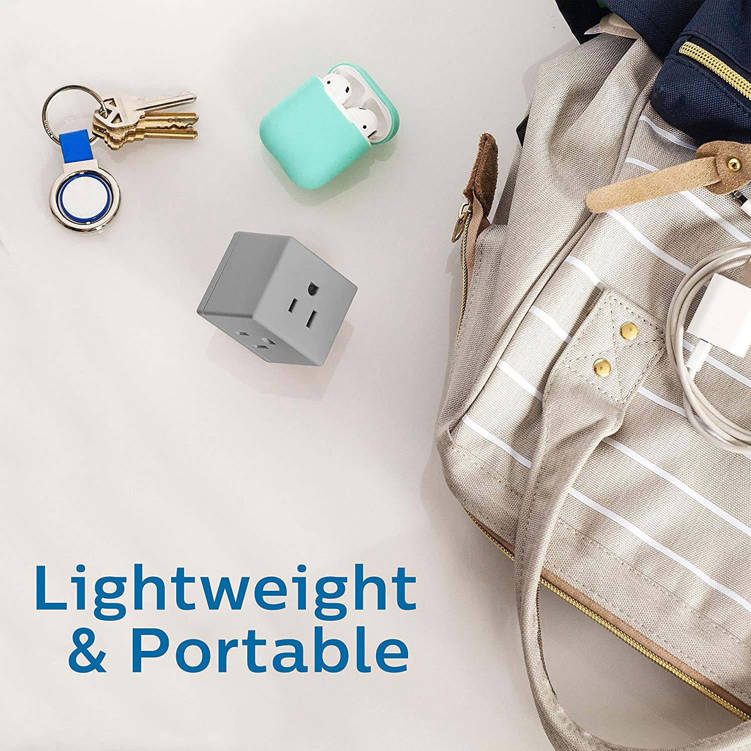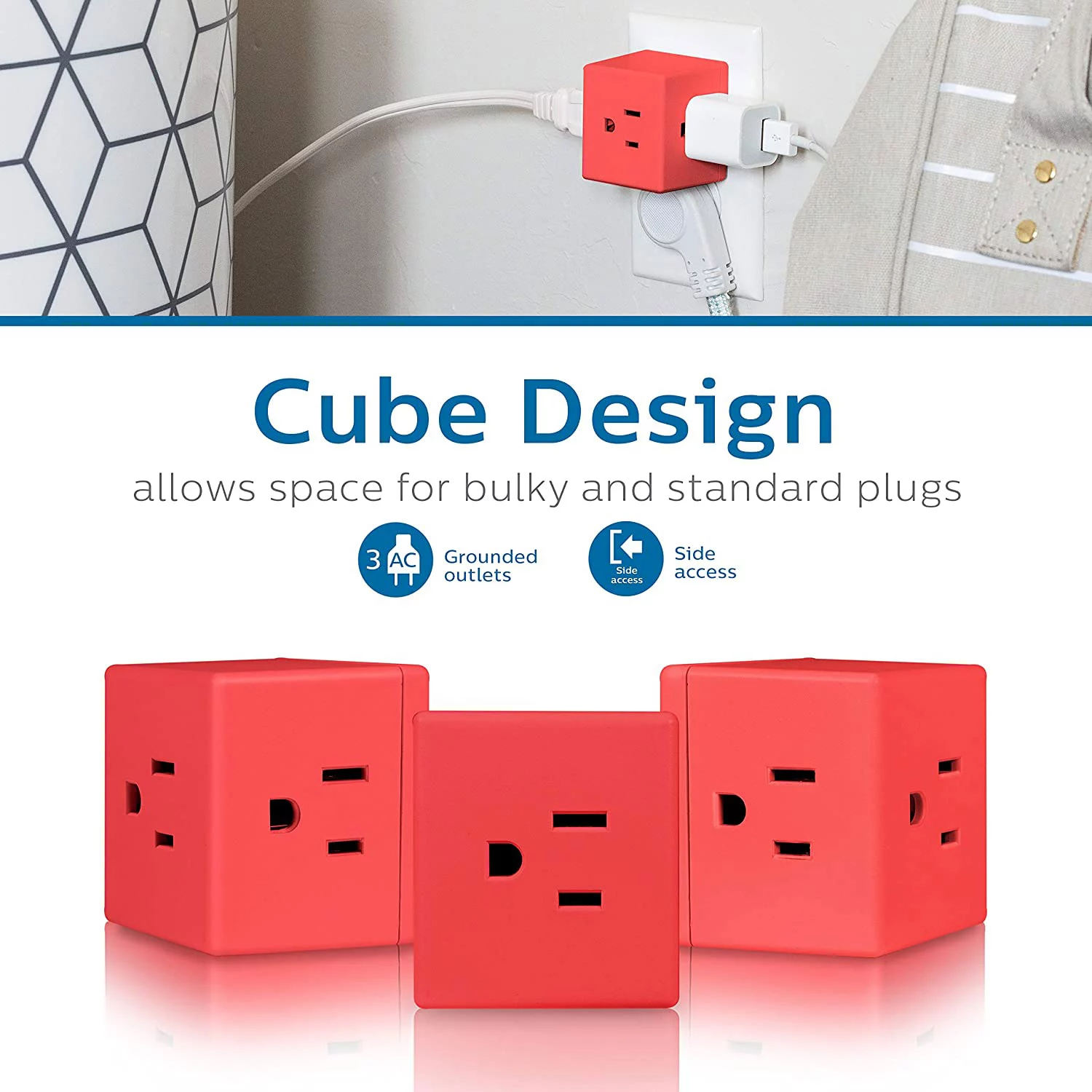 Get triple the power with a Philips 3-Outlet Cube Tap Adapter. Expand a standard grounded outlet into three with this wall tap cube with a three-prong outlet on three sides of the block. The adapter's unique shape allows space for bulky plugs and standard plugs to use this outlet adapter simultaneously. Take it with you to work or school to satisfy your power needs on the go. With its innovative design and white finish, this compact adapter tap is perfect for creating a centralized powering station that doesn’t distract from your existing décor. This outlet adapter is UL Listed and has an electrical rating of 15A/125VAC/1875W. Make your outlets more versatile with the Philips 3-Outlet Cube Tap Adapter.