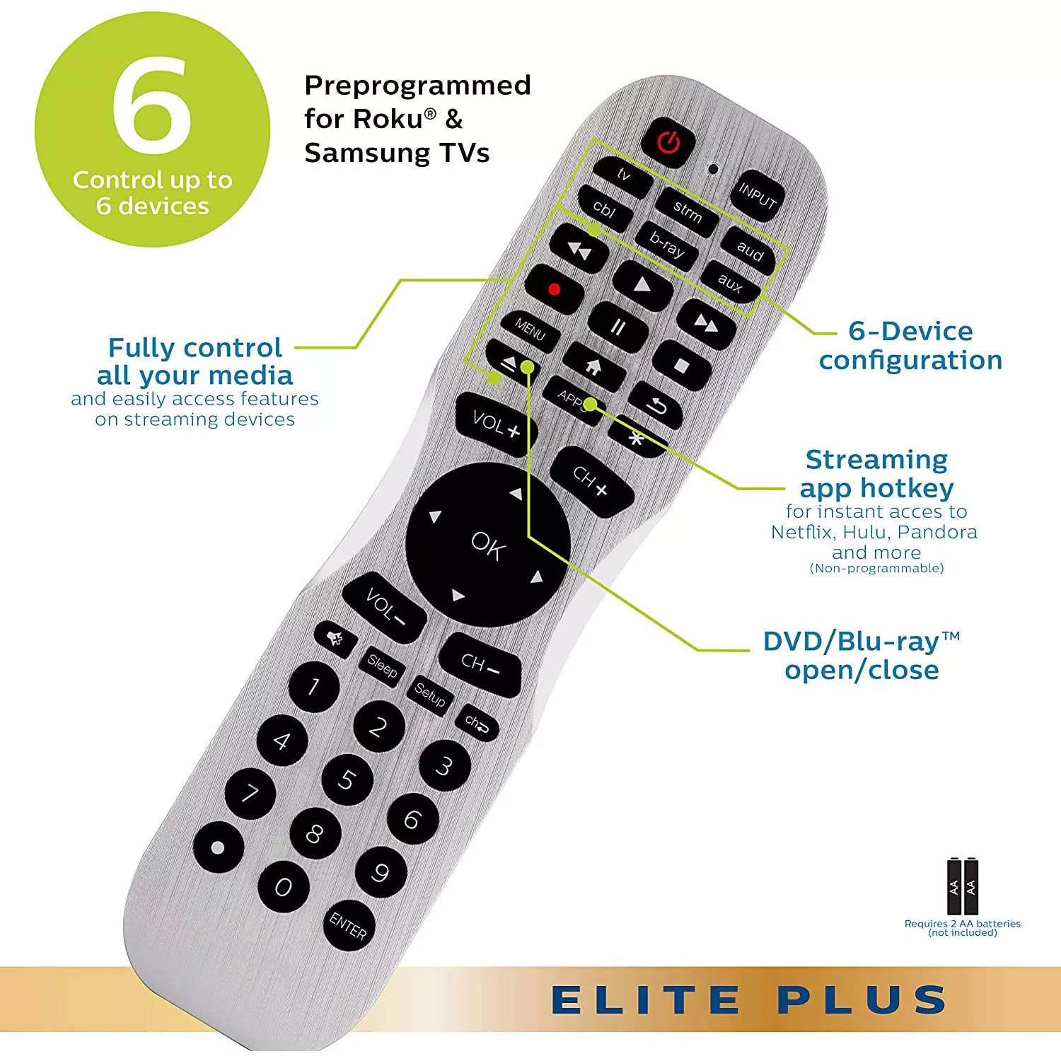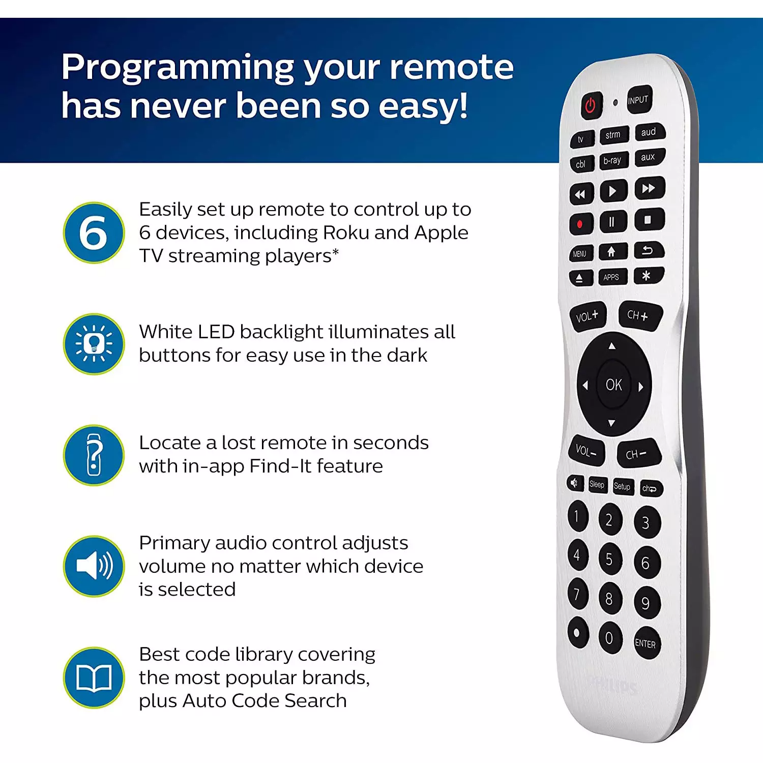 Compatible with all major brands, this universal remote supports thousands of the latest audio/video devices and will auto scan your equipment using its extensive remote code library. No matter which entertainment device is in play, master volume control gives you the power to adjust your TV’s audio. Access your favorite digital content through your Roku, Apple TV, or another streaming device (not compatible with Roku Streaming Stick and devices). Gain unmatched control of your remote and all your home entertainment devices with the Philips Universal Remote Control with Smartphone App.