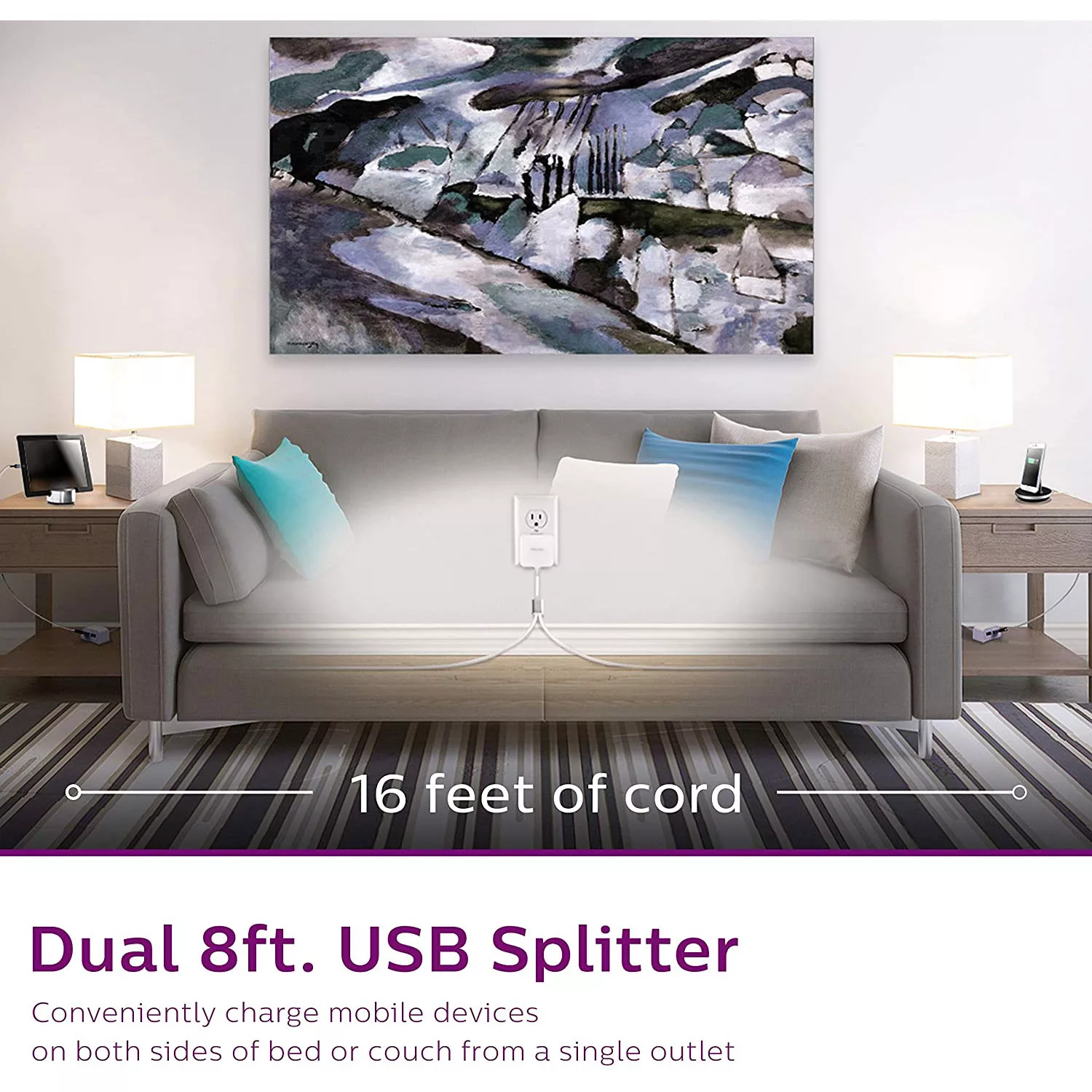With the Philips Twin USB Tabletop Charger, you’ll never have to worry about your bed, couch, or other inconveniently placed furniture getting in the way of a fast and efficient charge. The splitter has two cables that extend 8ft. in either direction from where it’s plugged in, making it easier than ever to set your mobile devices on the nearest surfaces – even if they’re on different sides of the room.