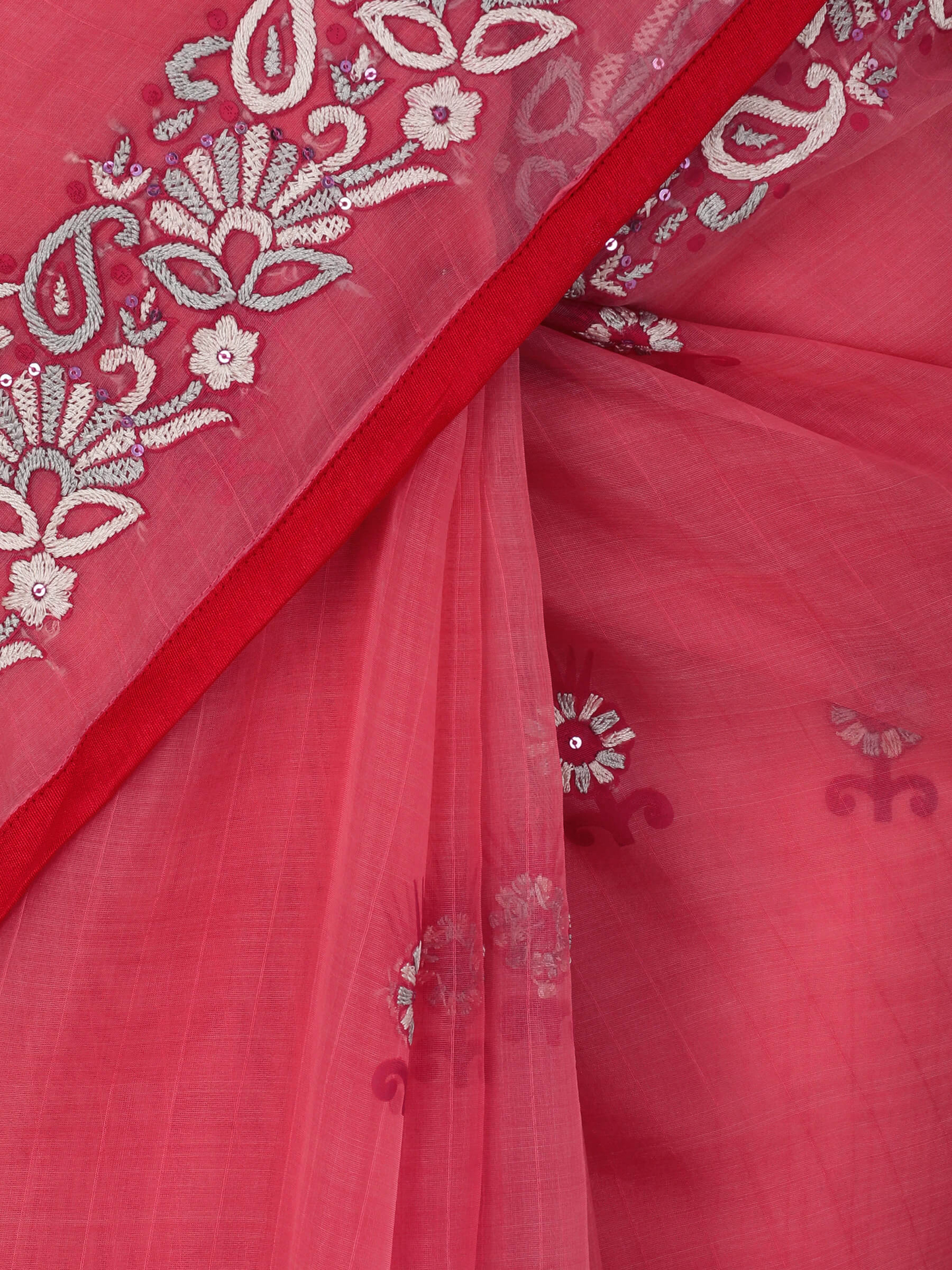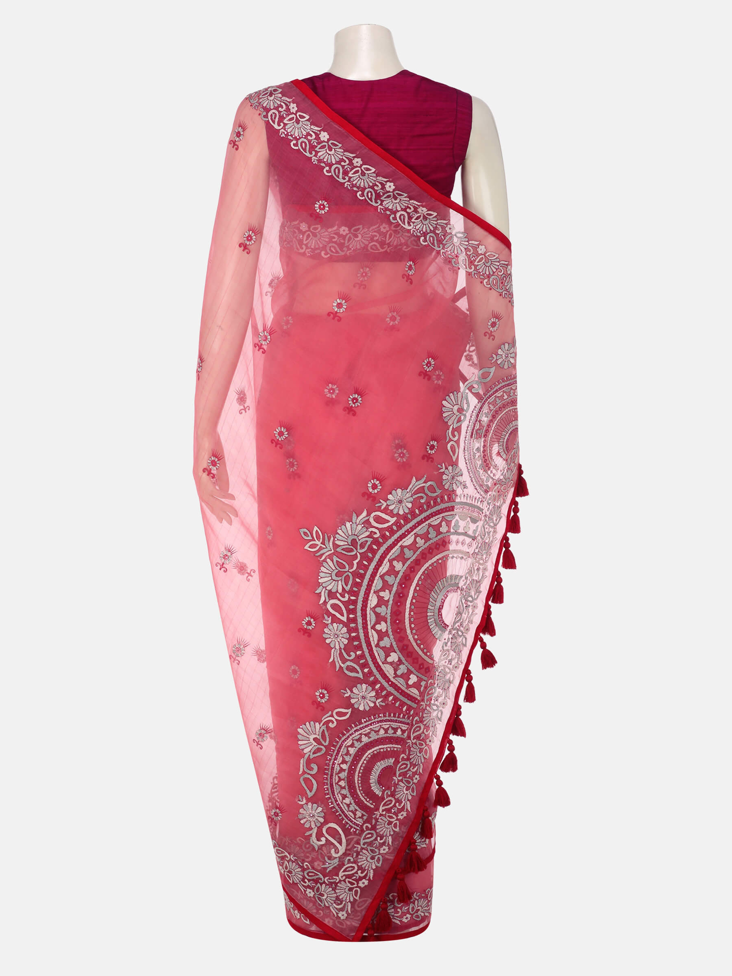 Pink muslin saree with white and grey embroidery over red prints. Features tassel trimmed aanchal. Comes with matching unstitched blouse piece.