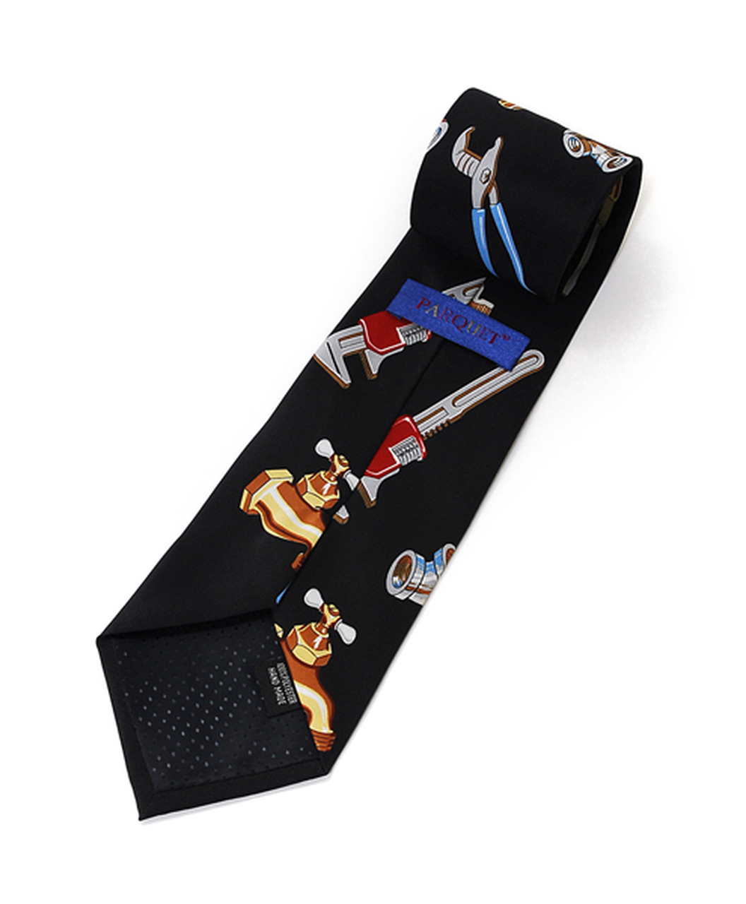 • Tie depicts plumbing tools on top of a black background