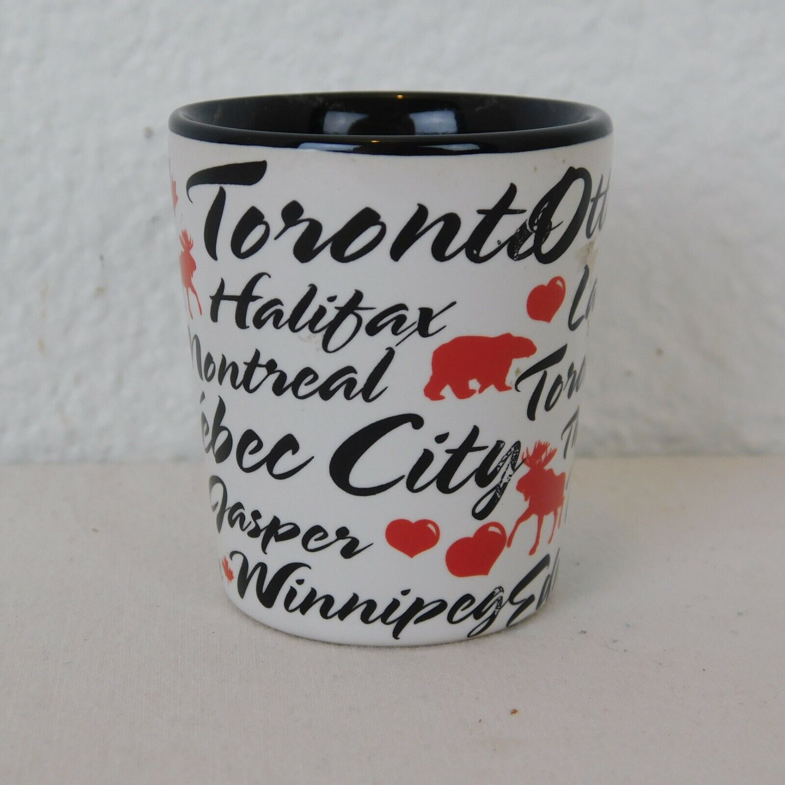 Here's a very rare and hard to find souvenir collectible shot glass from Canada. It's a 5x6cm style shot glass measuring 2.25" tall and 1.8" in diameter.