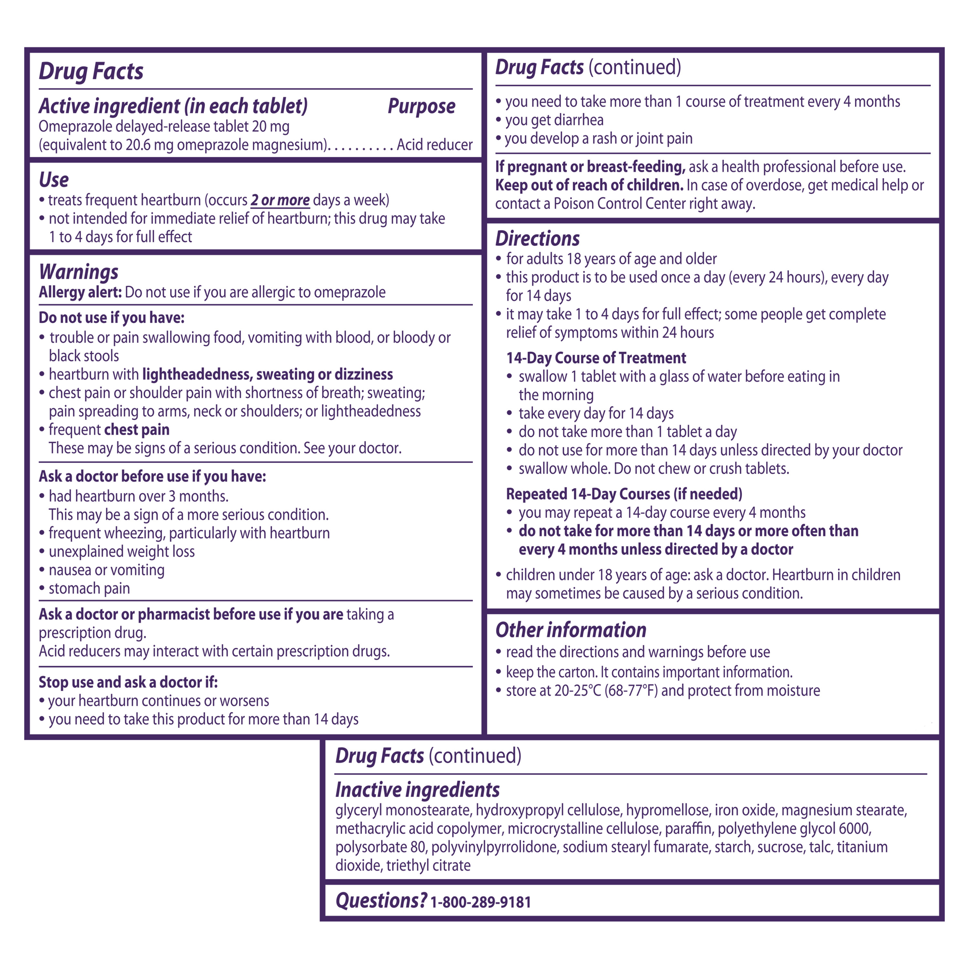Compare to Prilosec OTC® Active Ingredient. Treats Frequent Heartburn Occurring 2 or More Days Per Week. Three 14-day Courses of Treatment. Inhibits Acid Production at the Source. Delayed-Release Tablets.