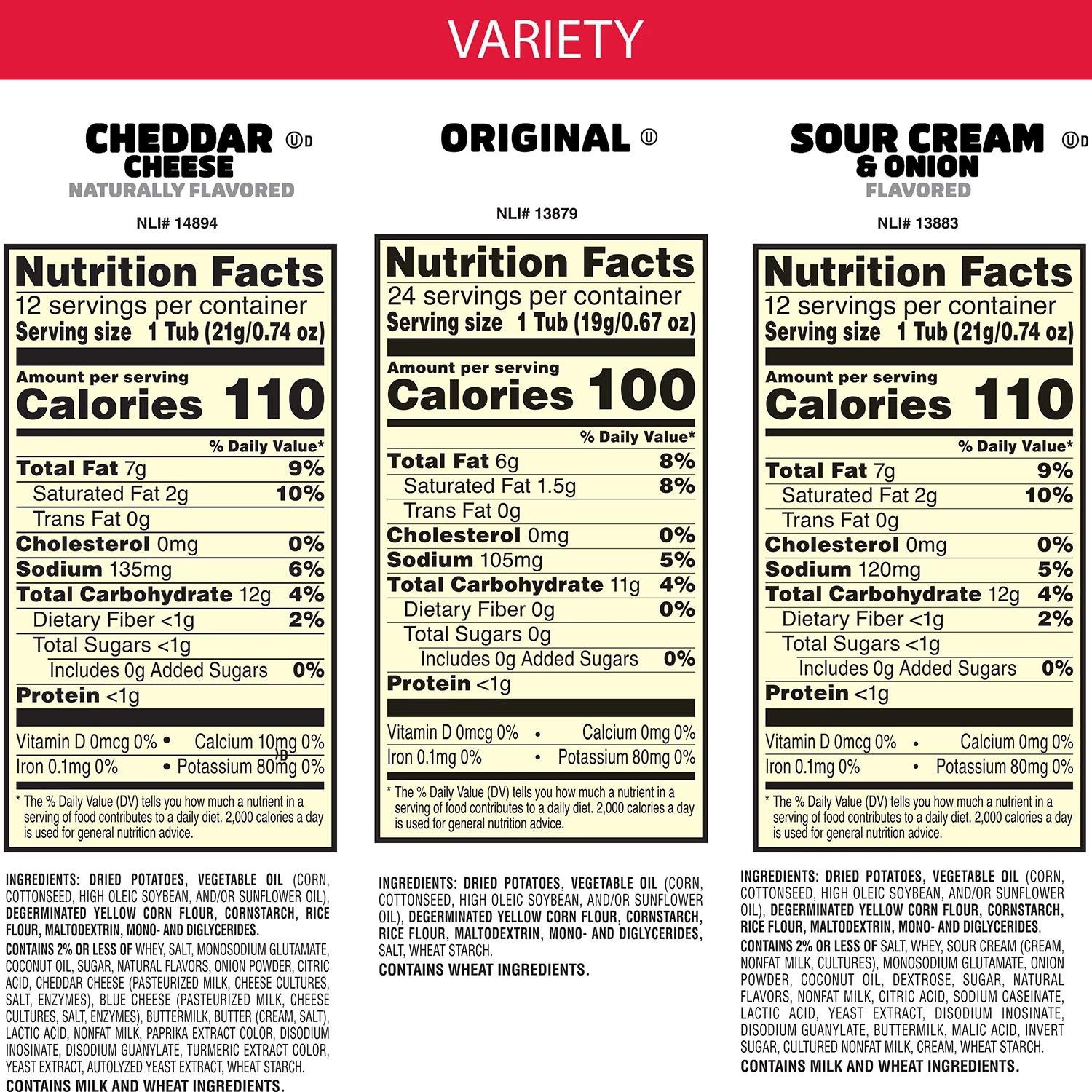 In this variety pack, there are three distinctive flavors: original, sour cream & onion, and cheddar cheese. Each flavor is unique and tasty.