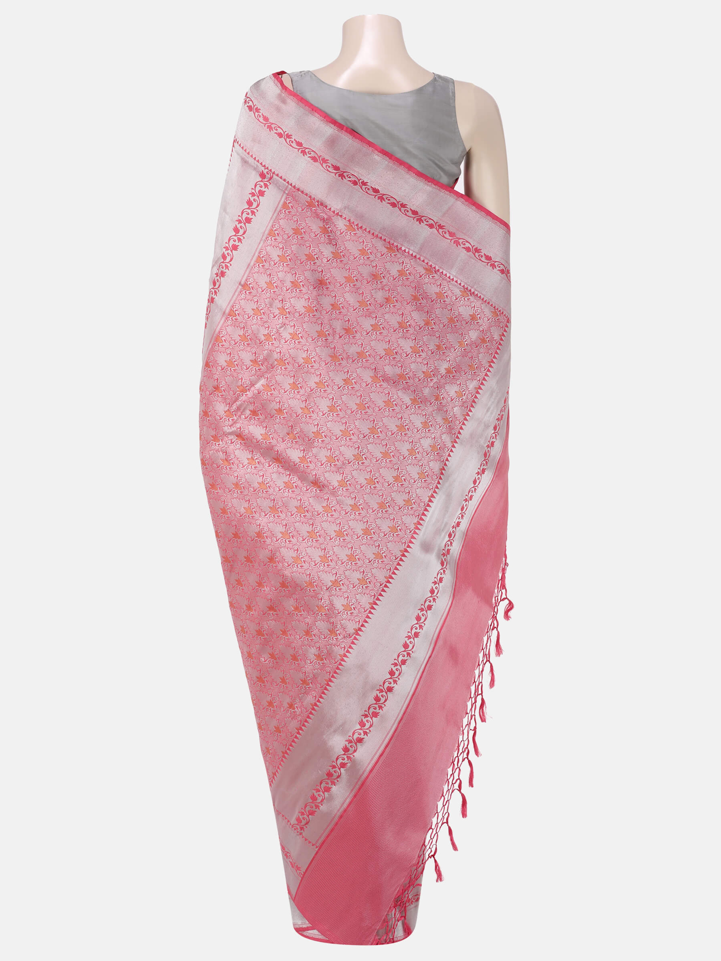 Punch pink Mirpur katan saree with silver and pastel orange weaving. Aanchal with fringe trim. Comes with matching unstitched blouse piece.