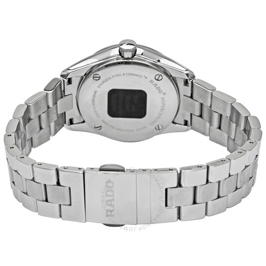 Rado Women's HyperChrome watch, 33 mm silver Ceramos case, black dial with silver-toned markers and hands, stainless steel bracelet with deployment clasp.