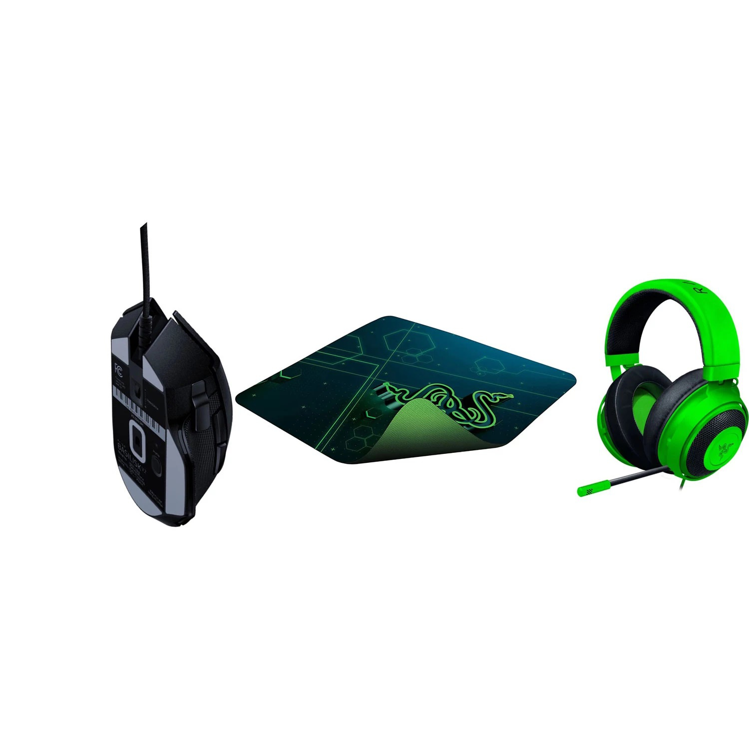 This Razer Basilisk V2 wired gaming mouse stores up to five profiles simultaneously, and the durable switches withstand up to 70-million clicks. This Razer Goliathus Mobile gaming mouse pad ensures a fast glide when you need speed and lets you stop on a dime when you want control. The 3rd generation Razer Kraken is engineered for long-lasting comfort with cooling-gel cushions. A retractable microphone ensures your shotcalls are always delivered in absolute clarity.