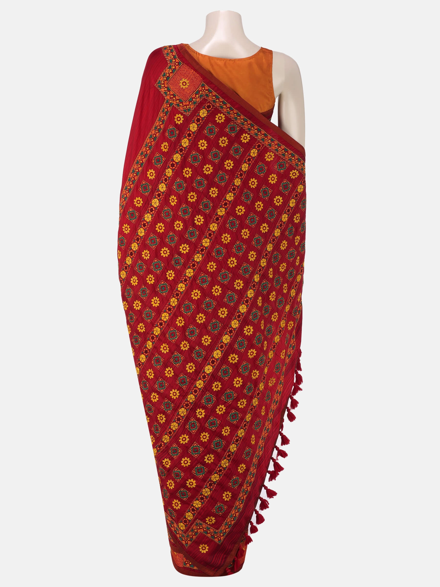 Red silk saree with maroon brush print and yellow, orange and green Nakshi kantha embroidery. Aanchal with tassel trim. Comes with unstitched blouse piece.