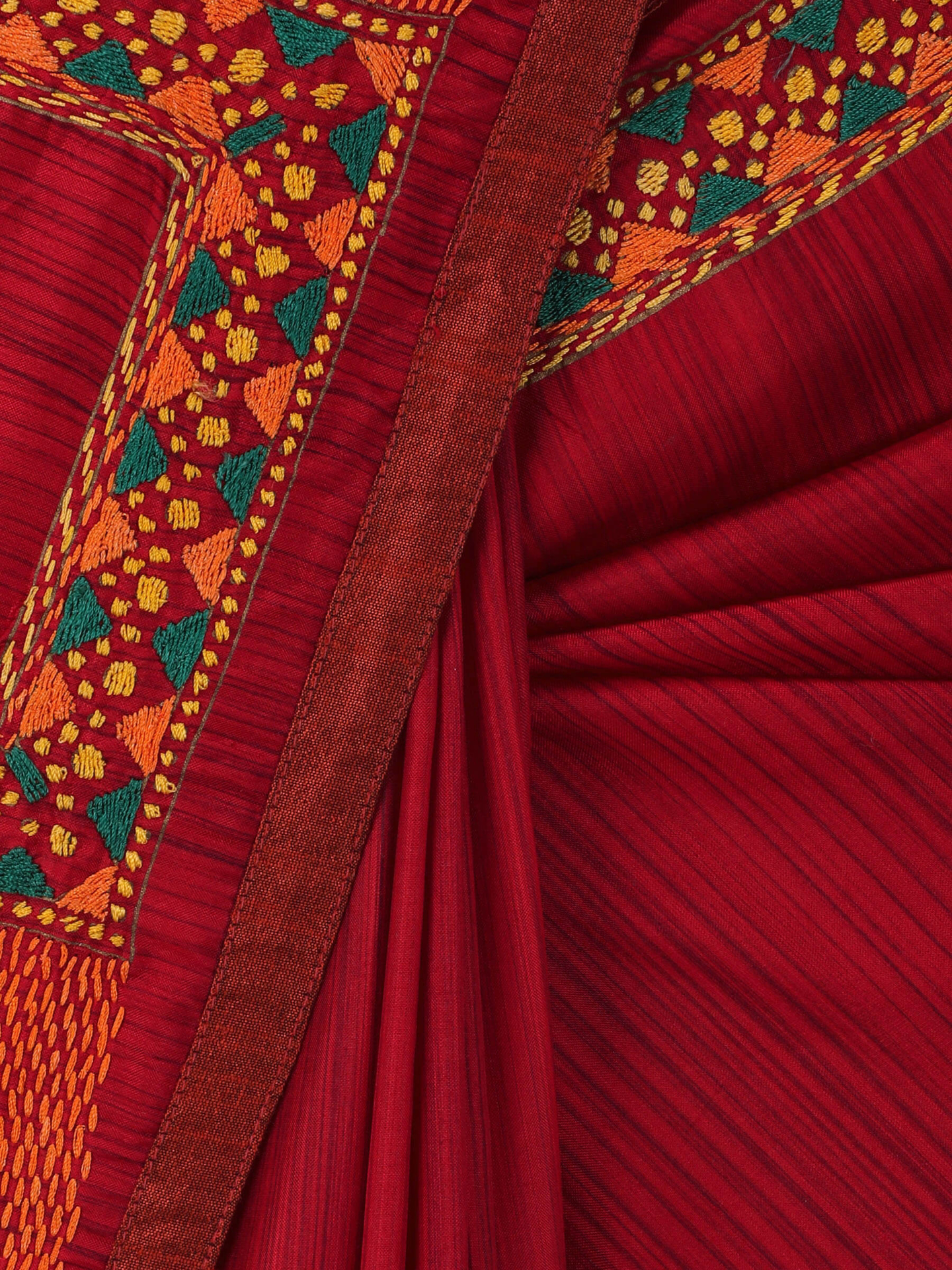 Red Brush Painted and Nakshi Kantha Embroidered Silk Saree