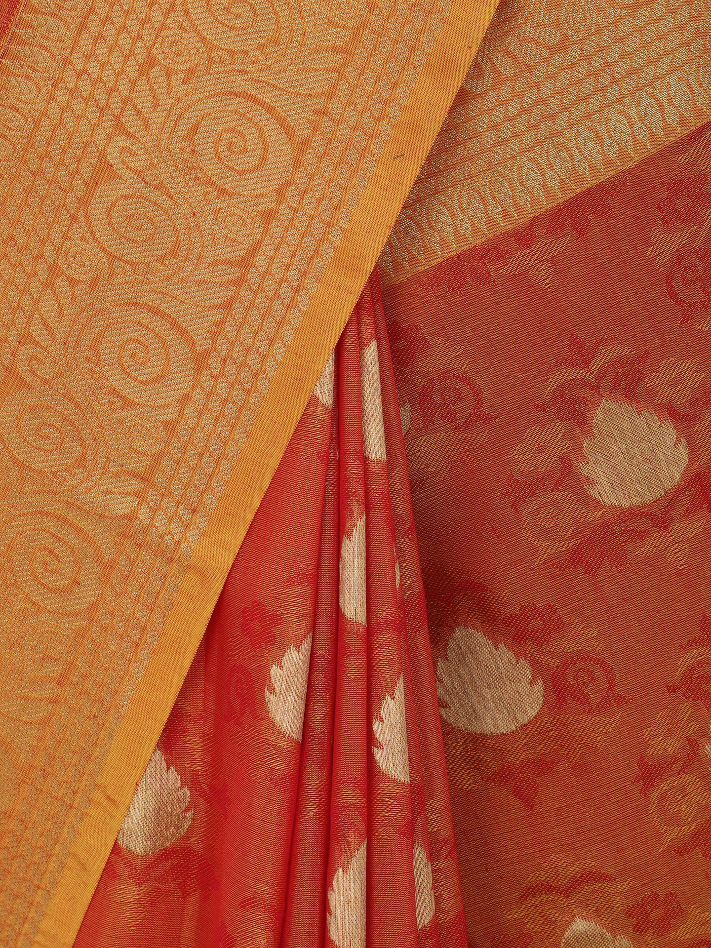Yellow and red dual tone Sirajganj half silk opera saree with golden weaving. Comes with unstitched blouse piece.
