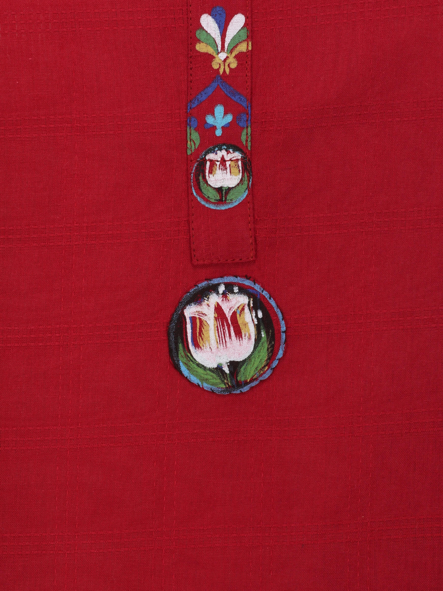 Red handloom cotton kameez with multicolour prints and red kantha stich. Comes with white jacquard textured printed cotton shalwar and white and red check printed handloom cotton dupatta with tassel trim.