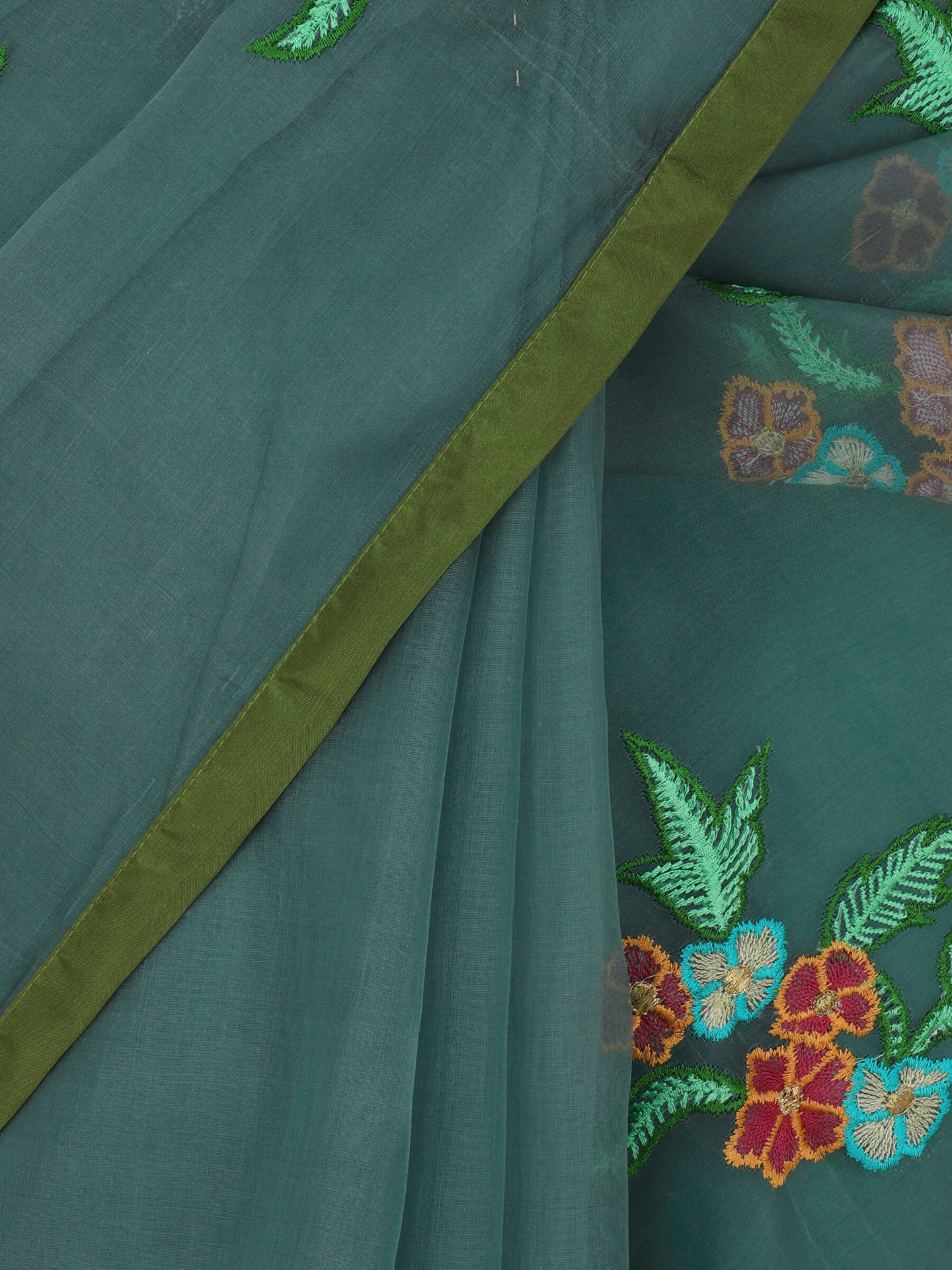 Sage Green Embroidered and Appliqued Muslin Saree