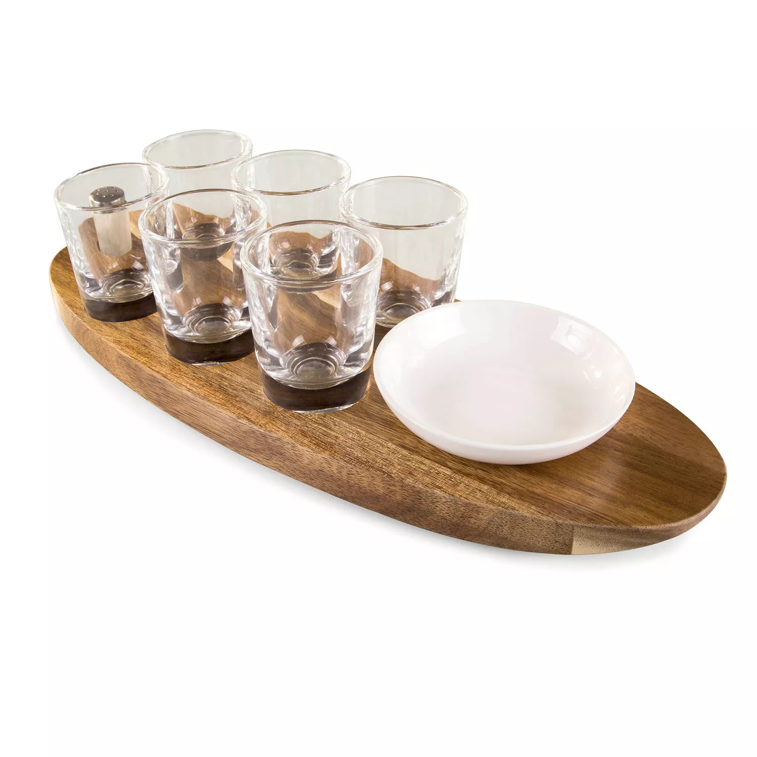 Balancing an elegant design with social conviviality, this Shot Glass Serving Set is perfect for sharing top-shelf spirits with your favorite people. Six heavy-bottomed shot glasses are included with a handsome acacia wood tray. The richly wood-grained tray features specifically carved-out indentations to keep the shot glasses from moving or tipping. Ideal for high-end tequila or mezcal tastings, the tray also has sections for an included salt shaker and a 4" garnish dish to place items like limes, olives, and cherries.