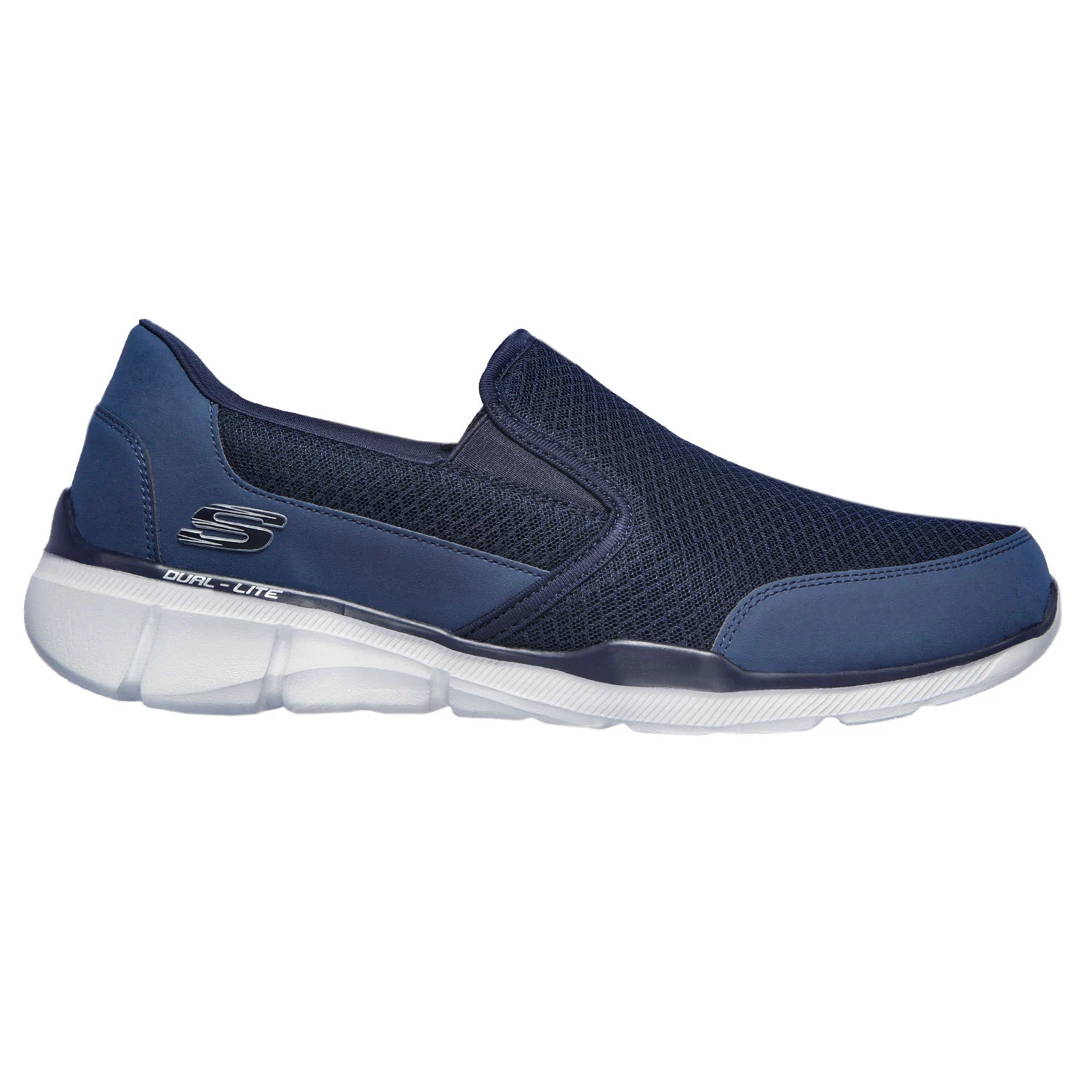 Slip on the amazing comfort and sporty style and get going with the SKECHERS Equalizer 3.0 - Bluegate shoe. Sporty knit mesh and synthetic upper in a slip on athletic walking sneaker with stitching accents. Air-Cooled Memory Foam insole, Dual-Lite midsole.