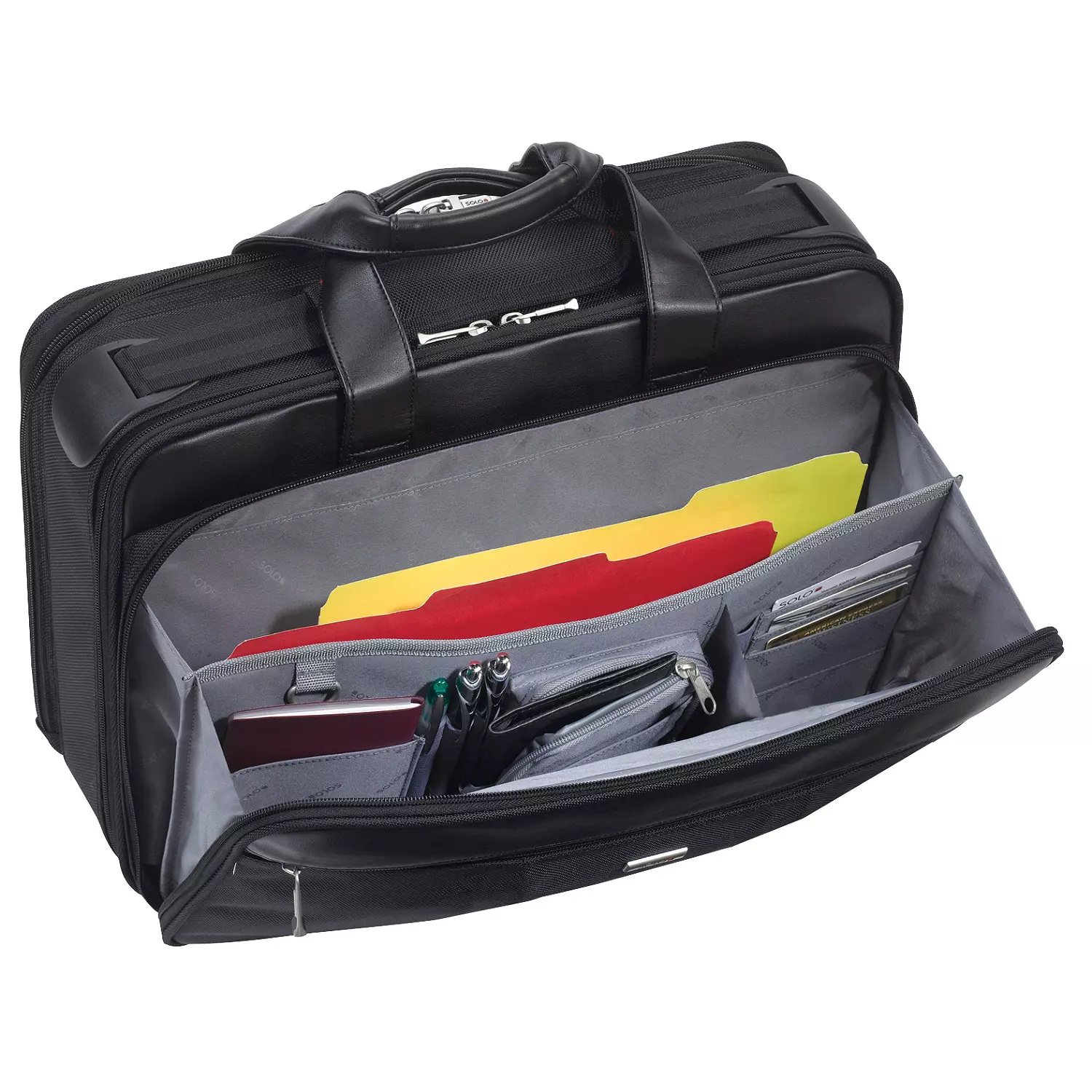 The SOLO Classic Collection Smart Strap Laptop Portfolio holds up to 16" laptops. The SmartStrap shoulder strap automatically retracts into the case frame when not in use.