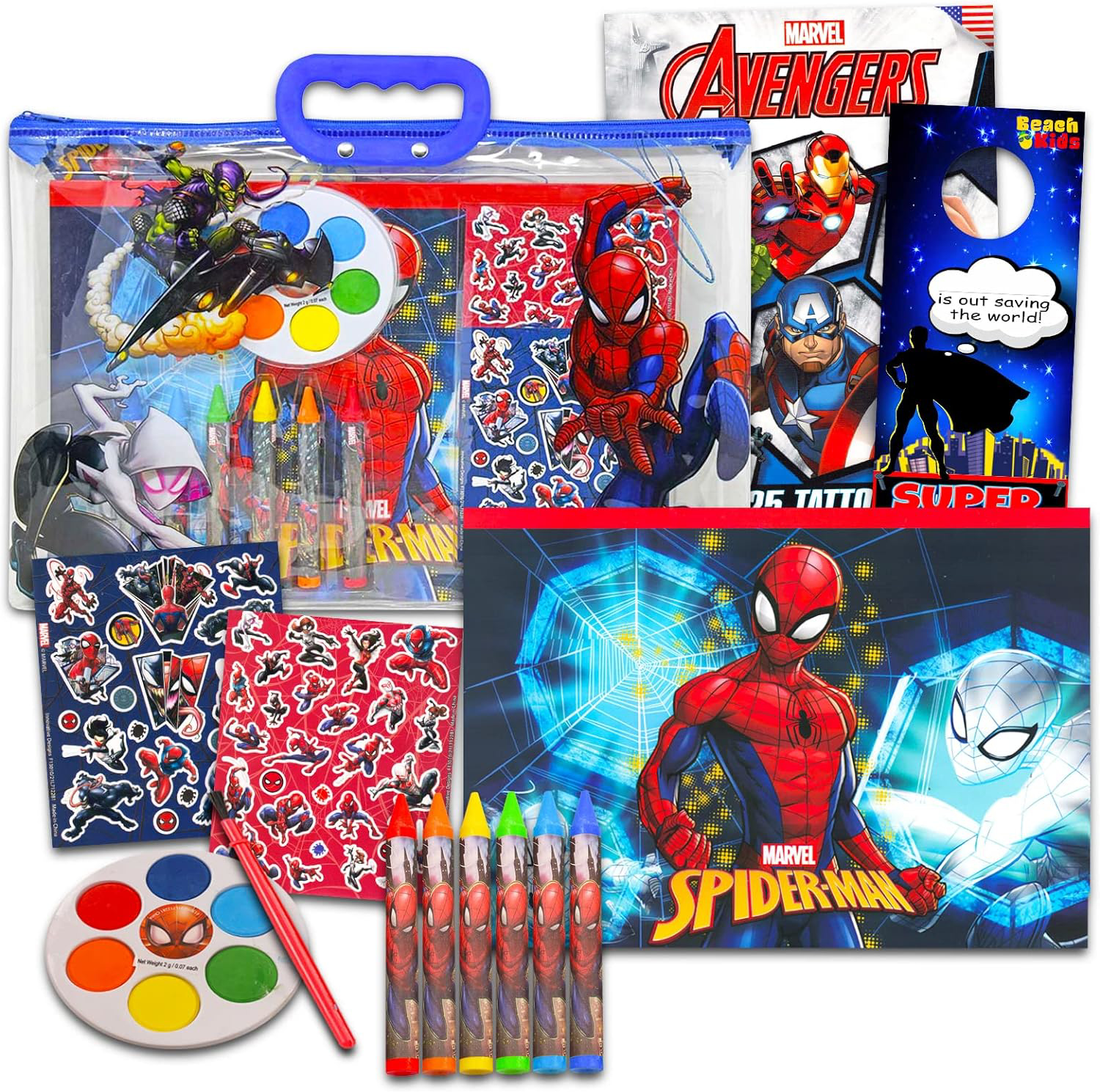 Officially licensed Spiderman stationery and arts and crafts supplies for kids. The Spiderman art tote bag also comes with bonus Avengers temporary tattoos and a superhero door hanger.