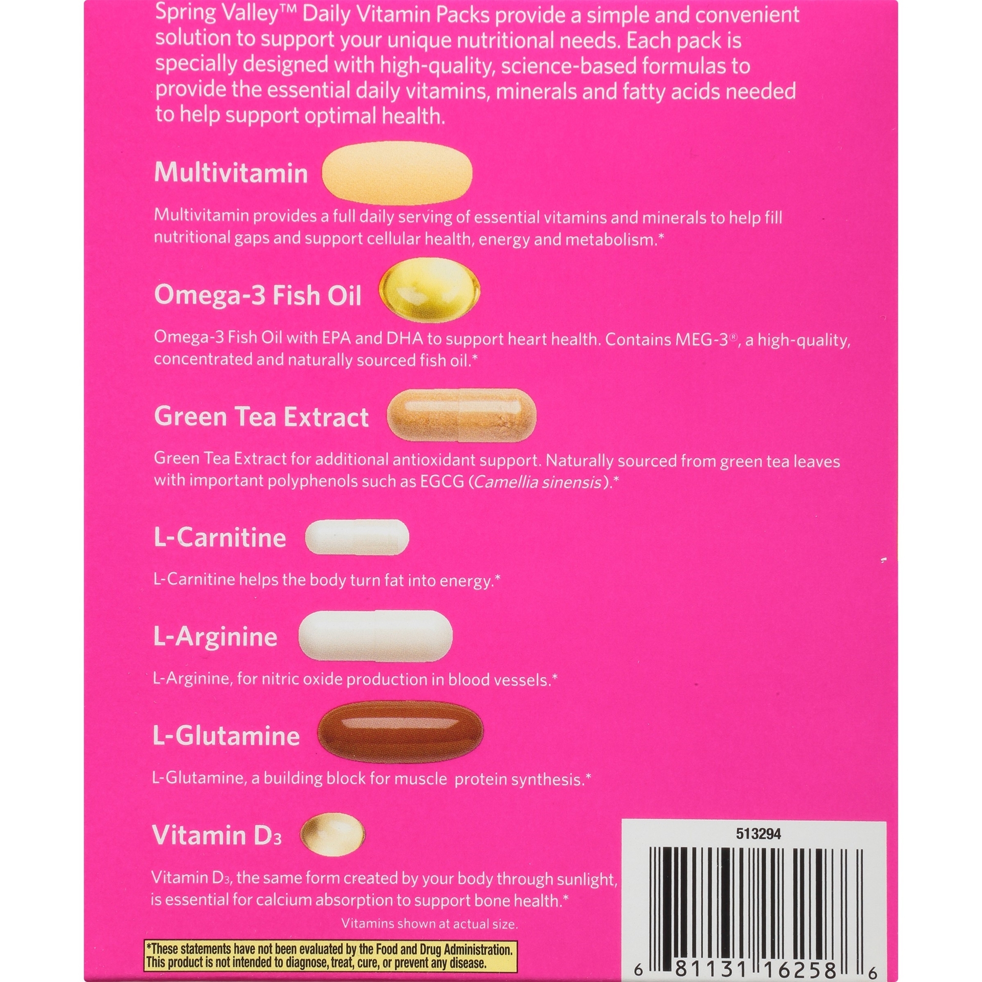 Spring Valley Daily Vitamin Packs provide a simple and convenient solution to support to support your unique nutritional needs. Each pack is specially designed with high-quality, science-based formulas to provide the essential daily vitamins, minerals and fatty acids needed to help support optimal health. SV DLY VP WMN 30CT
