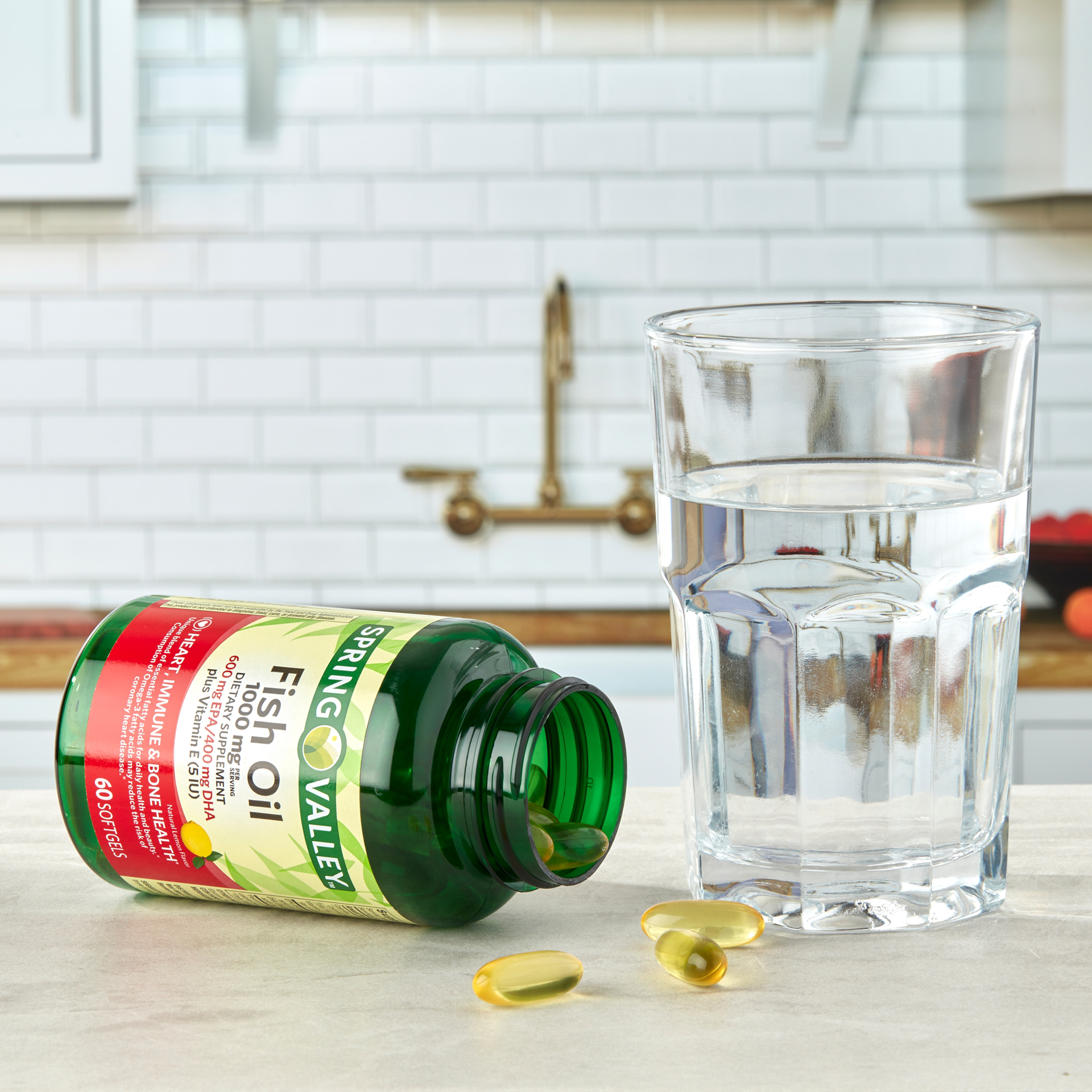 Spring Valley Fish Oil Softgels, 1000 mg are dietary supplements that promote heart, immune, and bone health. The consumption of Omega-3 fatty acids may reduce the risk of coronary heart disease. This unique blend of essential fatty acids for daily health and beauty contains 600 milligrams of EPA, 400 milligrams of DHA, and 5IU of vitamin E in every serving. They have a natural lemon flavor and contain no gluten, dairy, sweeteners, artificial colors, or artificial flavors. The suggested adult dosage is one softgel, three times daily, preferably with a meal. You can rest assured that Spring Valley Fish Oil Softgels, 1000 mg are produced with strict quality guidelines and are backed by our quality guarantee.