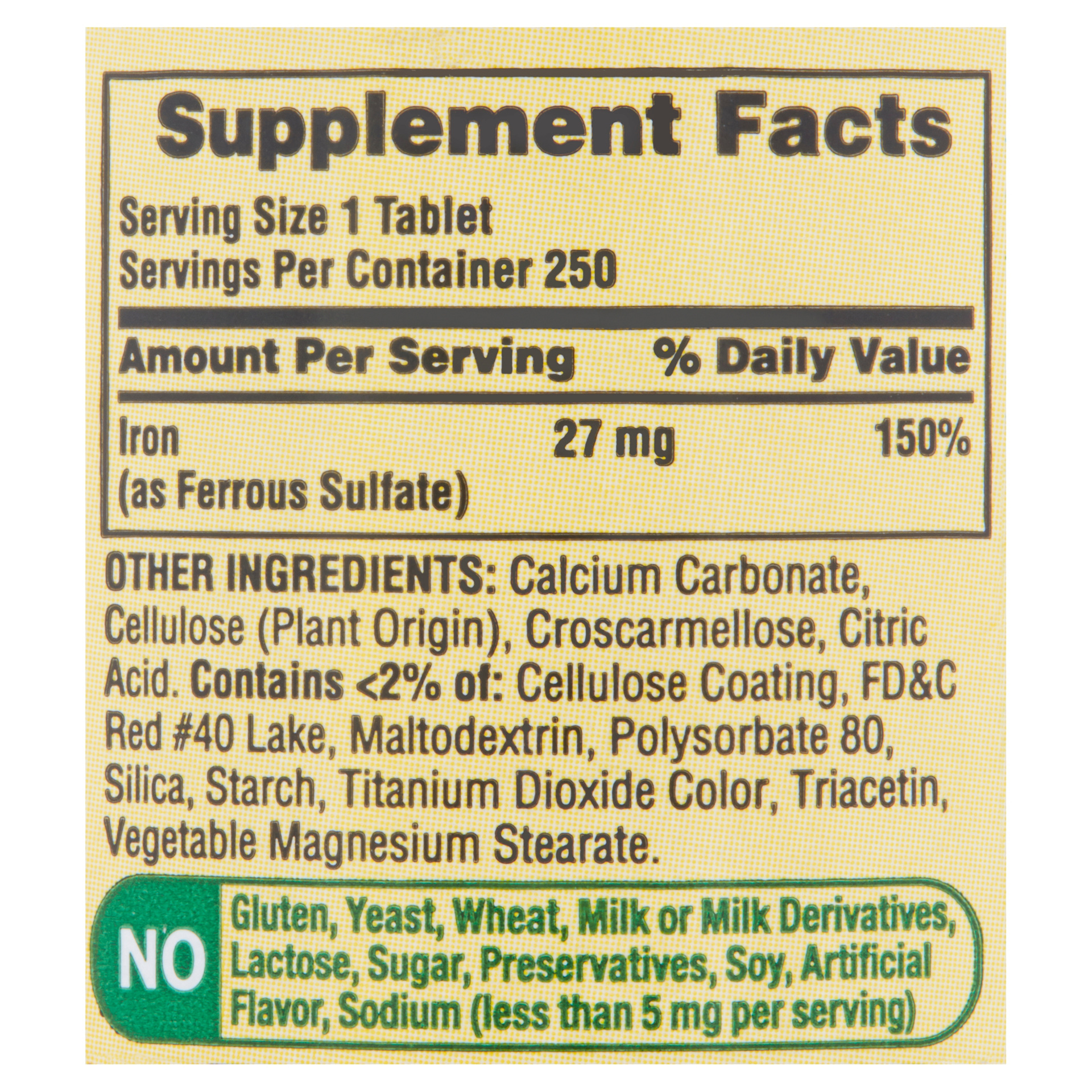 Spring Valley Iron Tablets, 27 mg is a dietary supplement designed to provide general wellness and nutritional support. Iron is an essential mineral that supports normal red blood cell formation. Suggested adult dosage is one tablet daily, preferably with a meal. These tablets are free of gluten, yeast, wheat, milk, milk derivatives, lactose, sugar, preservatives, soy, artificial flavor, and contain less than 5 milligrams of sodium per serving. You can rest assured that Spring Valley Iron Tablets, 27 mg are produced with strict quality guidelines and are backed by our quality guarantee.