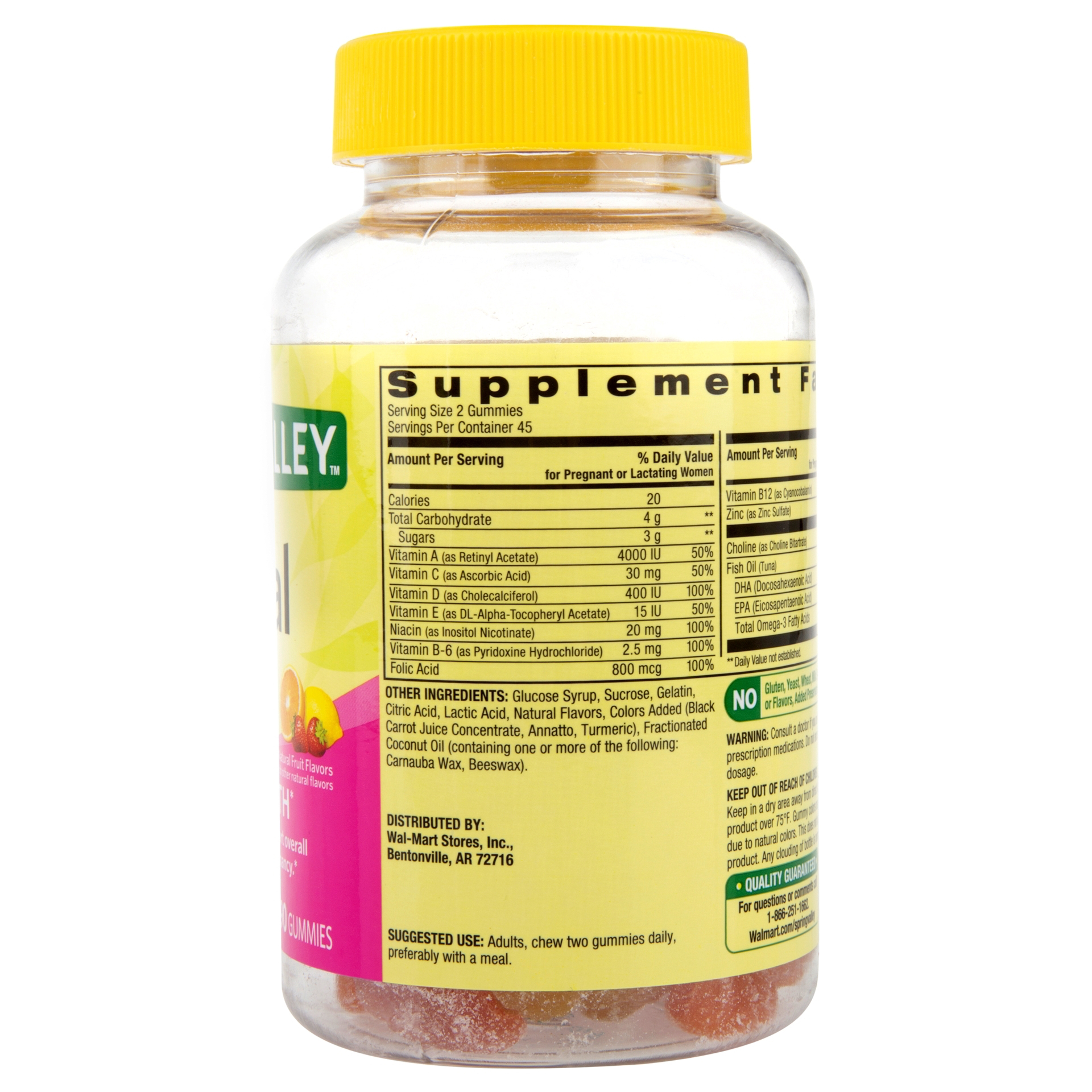 Help ensure that your body is getting the nutrition it needs with the right supplements, such as Spring Valley Gluten-Free Gummies. This product is specially formulated for daily consumption by pregnant women, with two gummies per serving. This multivitamin is packed with the daily essentials plus DHA and folic acid, both of which contribute to the health of your growing baby. They're chewable and have refreshing fruit flavors that make them easy to take. These adult gummies can be taken before, during and after a pregnancy as a fruity daily supplement for just about any grownup. What's more, they do not contain any gluten, wheat, egg, milk, artificial flavors or colors. These Spring Valley Gummies comes in 90-count bottle.