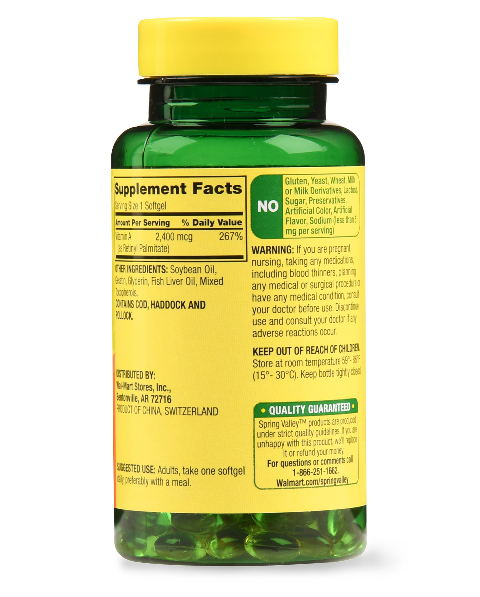 Spring Valley Vitamin A Softgels, 2400mcg, 250 Count: