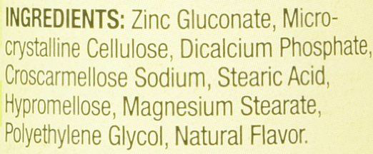 Ingredients: Zinc Gluconate, Microcrystalline Cellulose, Dicalcium Phosphate, Croscarmellose Sodium, Stearic Acid, Hypromellose, Magnesium Stearate, Polyethylene Glycol.