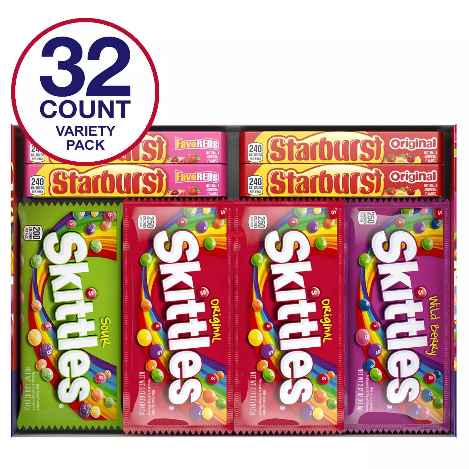 With 32 full-size packs in every box, this bulk chewy candy assortment has enough candy for stocking the office pantry or packing in your family's lunches. Fruity, chewy, and loved by all, keep everyone's favorite colorful candies on hand with this assortment of Skittles and Starburst Candies. Perfect for parties, game-time and movie night snacks, or simply enjoyed as an afternoon treat. Bring more fruity candy fun to your pantry with this bulk candy assortment. Look no further for bulk candy individually wrapped, 32 packs of Skittles and Starburst chewy candy will fit all your candy-filled occasions.