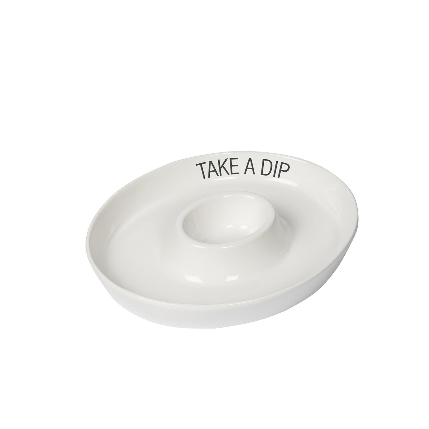 Minimalistic and modern, the "Take a Dip" White Oval Chip and Dip Platter offers plenty of room to serve all your favorite dippable appetizers. From tortilla chips and salsa to pita bread and hummus, this handcrafted ceramic chip and dip server is durable enough for daily use and perfect for parties. With "Take a Dip" stamped onto the rim, it's a great statement piece that urges guests to help themselves.