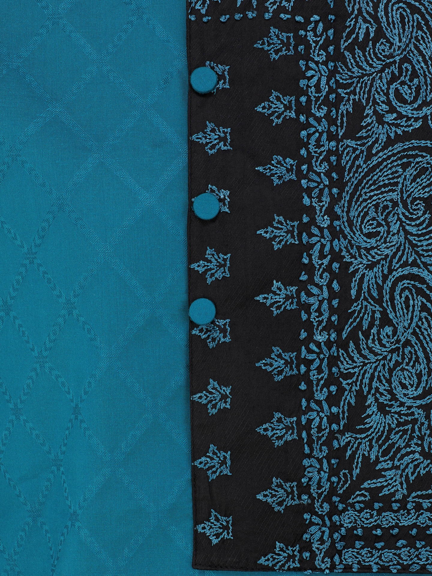 Teal textured cotton slim fit panjabi with teal embroidery on black textured patch. this panjabi useing very comfortable. made in bangladesh
