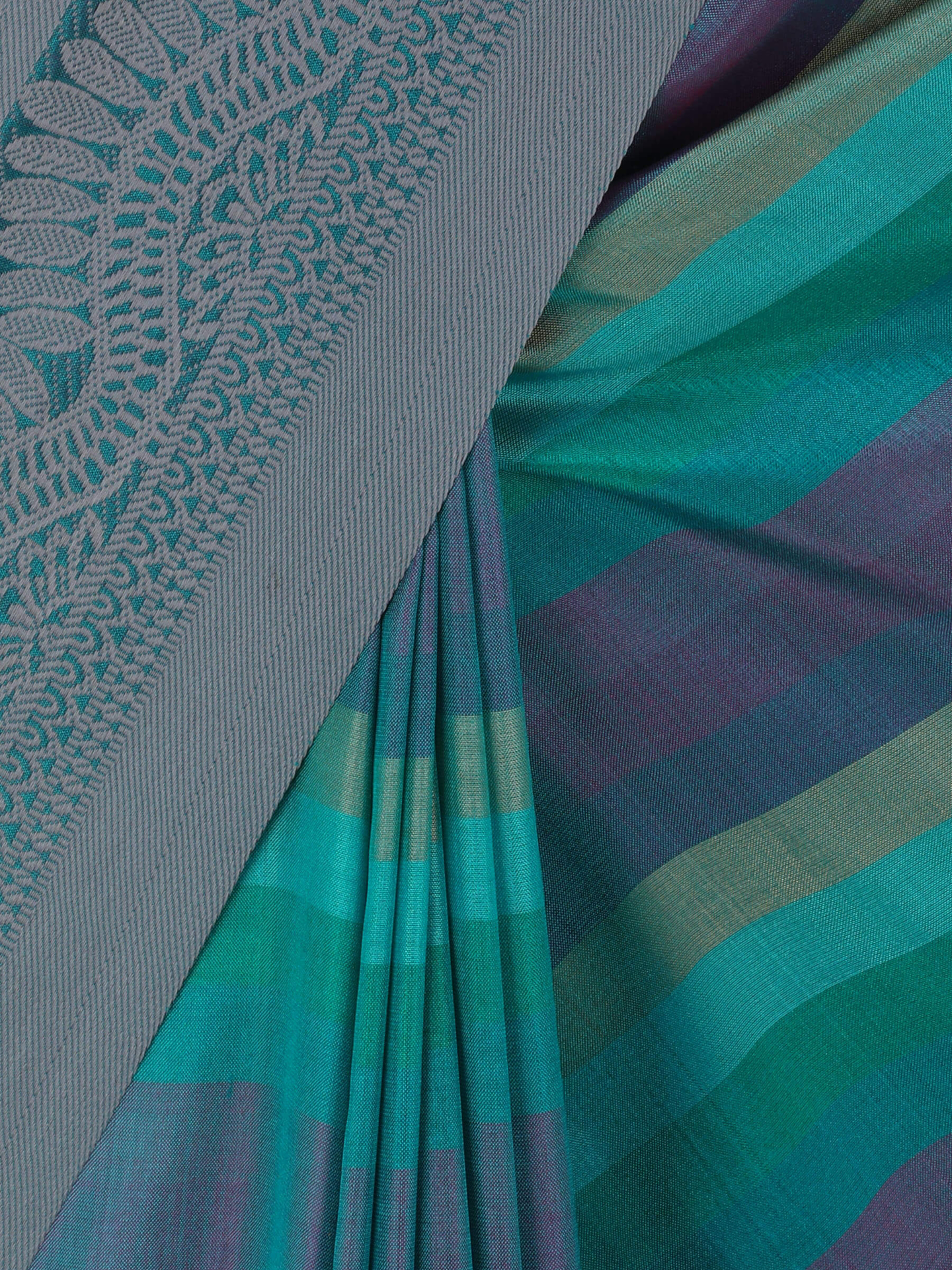 Teal , green, blue, purple and yellow striped Tangail soft silk baluchari saree with grey weaving. Aanchal with fringe trim. Comes with matching unstitched blouse piece.