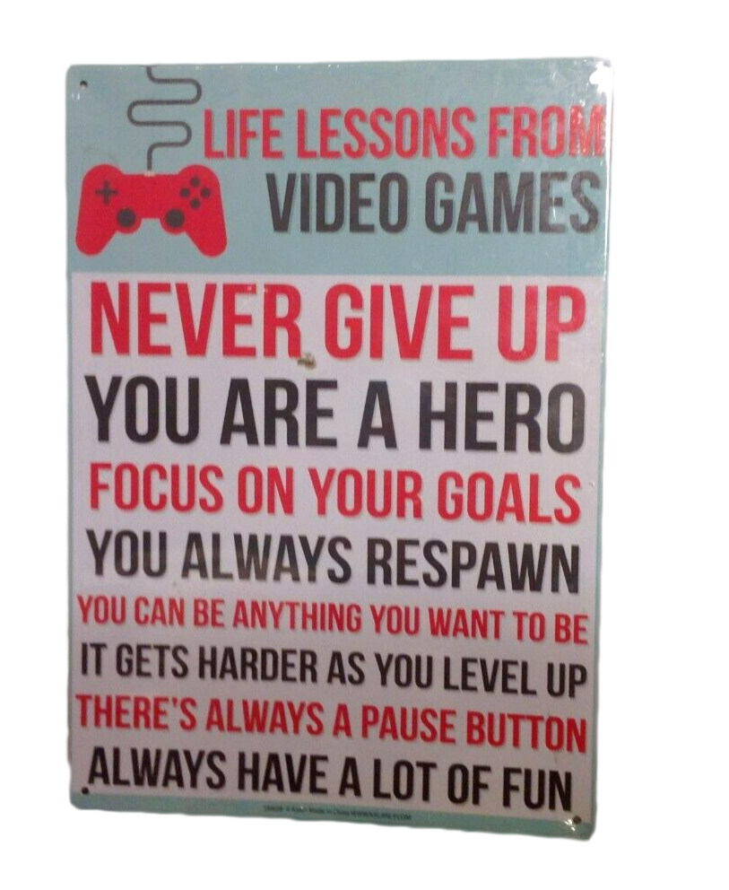 This is a metal wall sign featuring, "Life Lessons From Video Games"