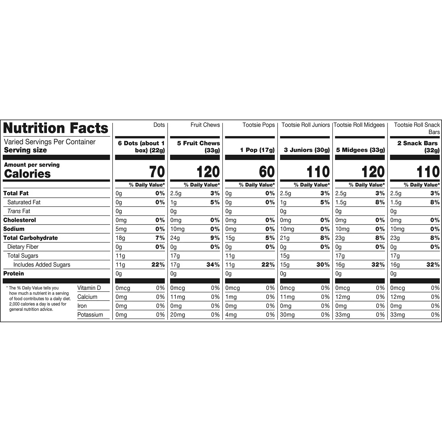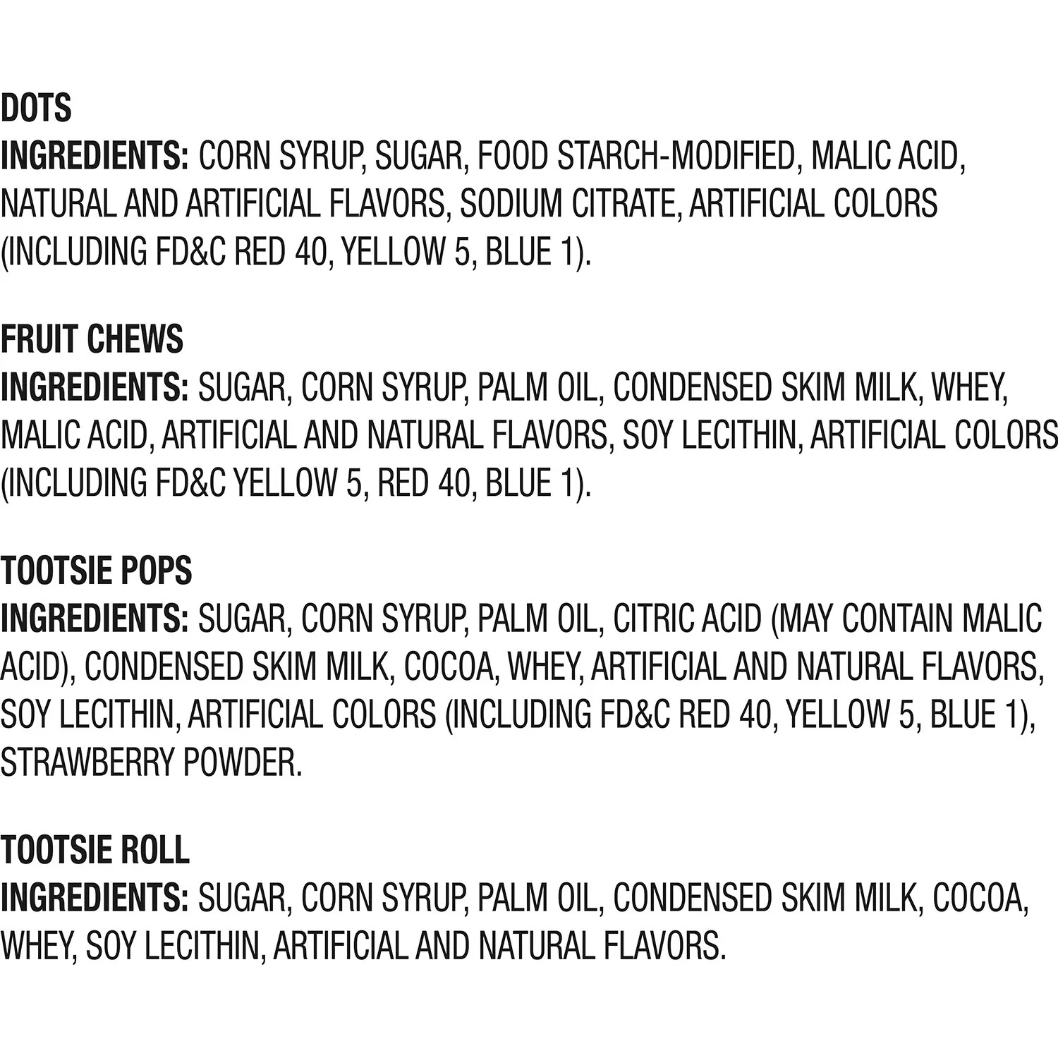 This variety bag comes with the following candies: Tootsie Fruit Chews, Tootsie Snack Bars, Mini Dots, Tootsie Pops and Tootsie Rolls Juniors. Choose from chewy and chocolate flavors, like the Tootsie Rolls Junior, or enjoy a burst of sweet fruit flavors with the Tootsie Fruit Chews. With so many flavors in one bag, you'll have plenty to share with your friends and family. Each piece of candy is both gluten-free and peanut-free as well.