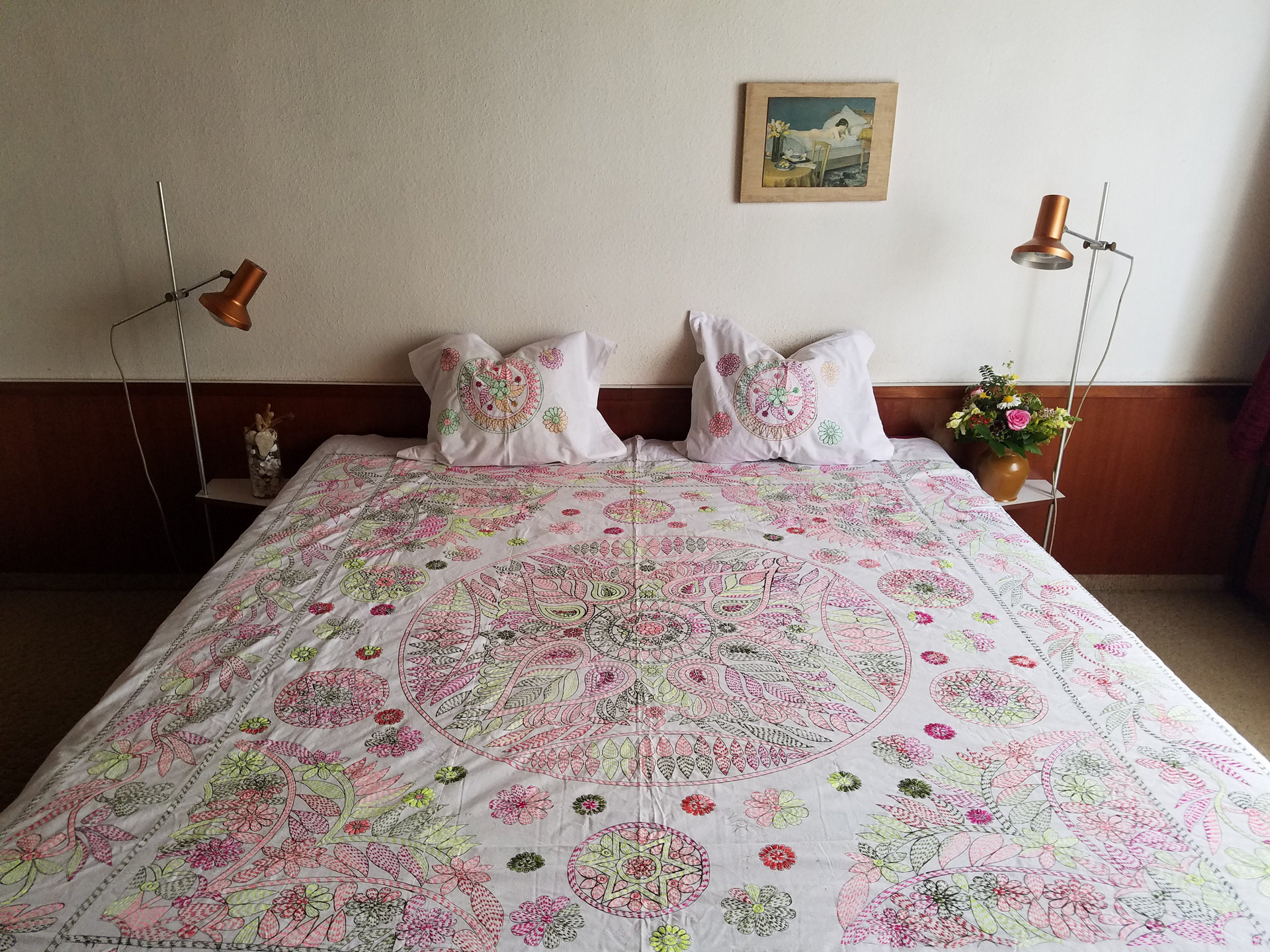 Nakshi katha is the expression of ultimate excellence of hand-stitching. It is one of the most famous traditional products of Bangladesh crafted on fabric with fingers by the rural women artisans with needle and silk thread. The colorful design of the nakshi katha is created by the creative minds of the rural artisan. Using different motifs and patching of stitches, they create story of village life, myths of folks, legends of history,joy and happiness of life, events of life even sometimes it becomes abstract with beautiful pattern (alpana). As nakshi katha is totally hand crafted every nakshi katha is unique in design and color. The tradition of nakshi katha is flowing among our society for centuries and still inspiring and adorable. Nakshi katha is mainly used as light quilt and is also used as bedspread. Hanging Nakshi katha on the wall can bring a different gorgeous look in the living room. Use of small nakshi katha for wrapping newborn is also very popular.Traditionally nakshi katha is stitched by the rural women in their leisure time. Rural women from different parts of the country posses this skill from family tradition. It takes around months or even years to finish a katha. This distinguishable needle work is very adorable to the urban people and also to the foreigners. Quality of nakshi katha depends on the fineness of the needle work, however size, design, choice of color, quality of fabric and the thread also makes the difference. Low grade fabric, below standard size, screen print to depict the design and very poor quality stitch sometimes harm the belovedness of this adorable traditional products. Nakshi katha is not just a piece of cloth; it is a part of the tradition and culture in Bangladesh, it is the expression of hand stitching capability of the rural artisans. Make it a habit to gift nakshi katha in every occasion that will bring smile not only to your beloved ones but also bring joy to the un-privileged rural women.