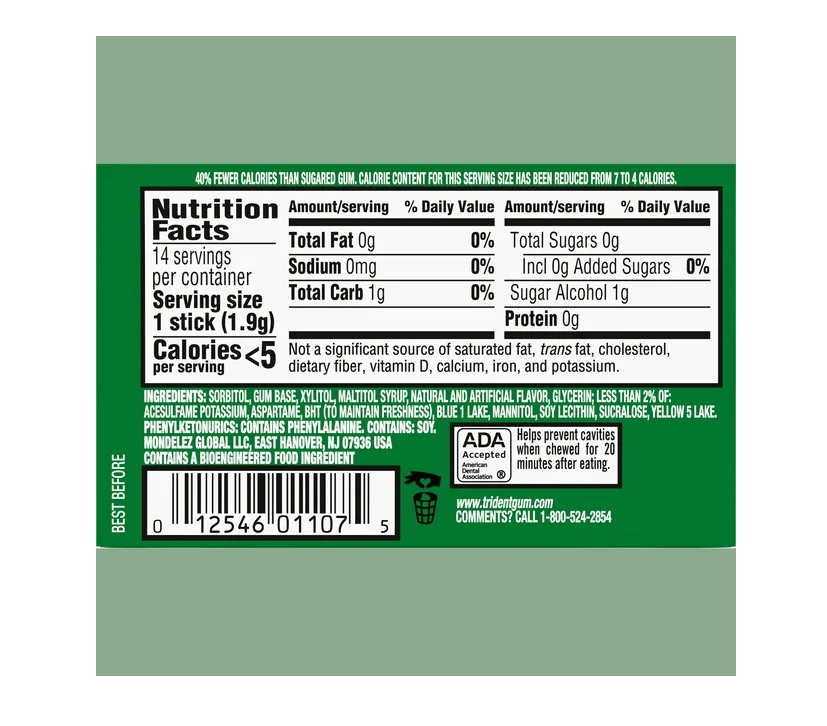 Sorbitol, Gum Base, Xylitol, Maltitol Syrup, Natural And Artificial Flavor, Glycerin; Less Than 2% Of: Acesulfame Potassium, Aspartame, Bht (To Maintain Freshness), Blue 1 Lake, Mannitol, Soy Lecithin, Sucralose, Yellow 5 Lake.Phenylketonurics: Contains Phenylalanine.Contains: Soy.