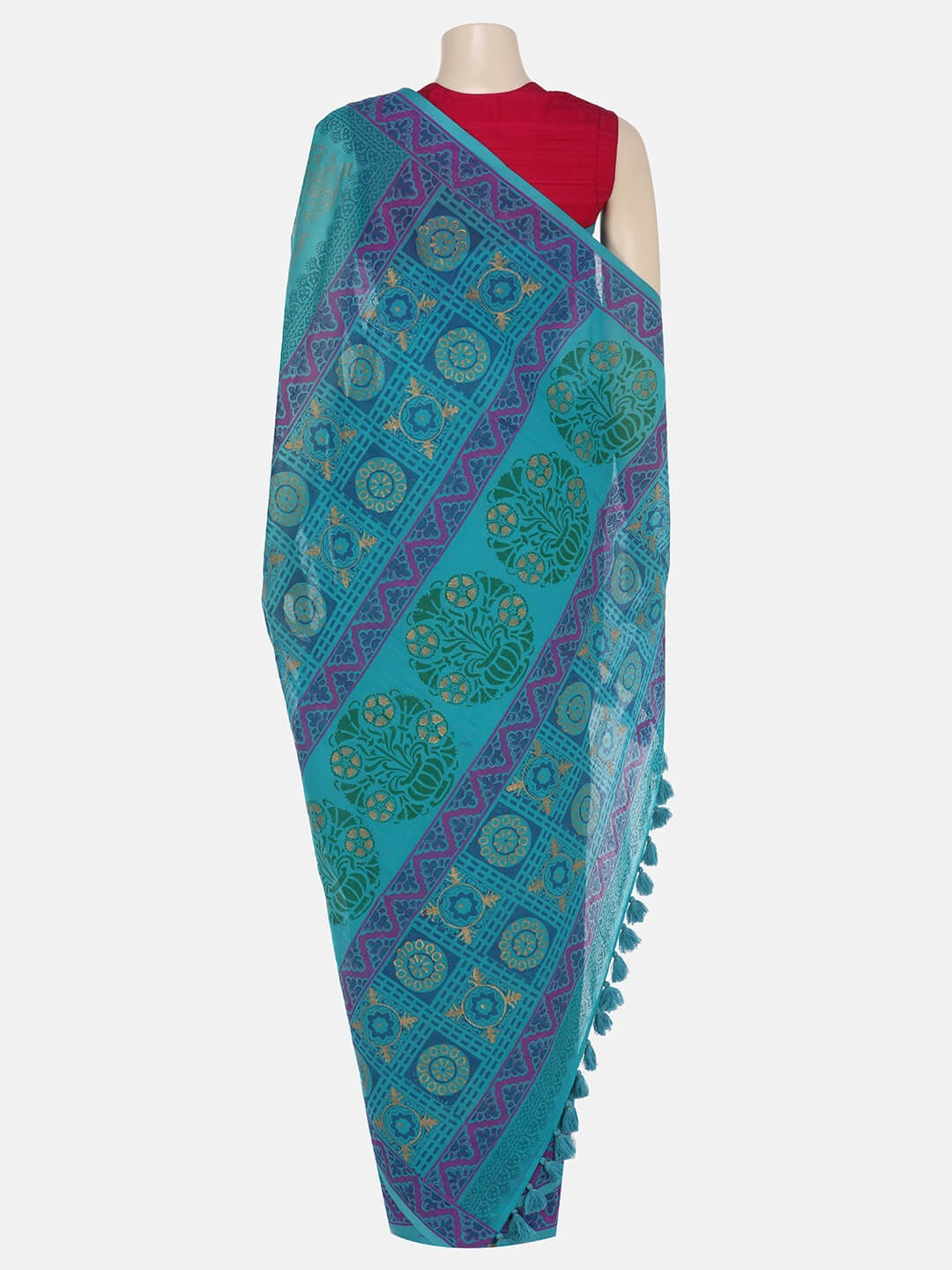 Turquoise printed cotton saree with tassel trimmed aanchal. Comes with matching unstitched blouse piece.