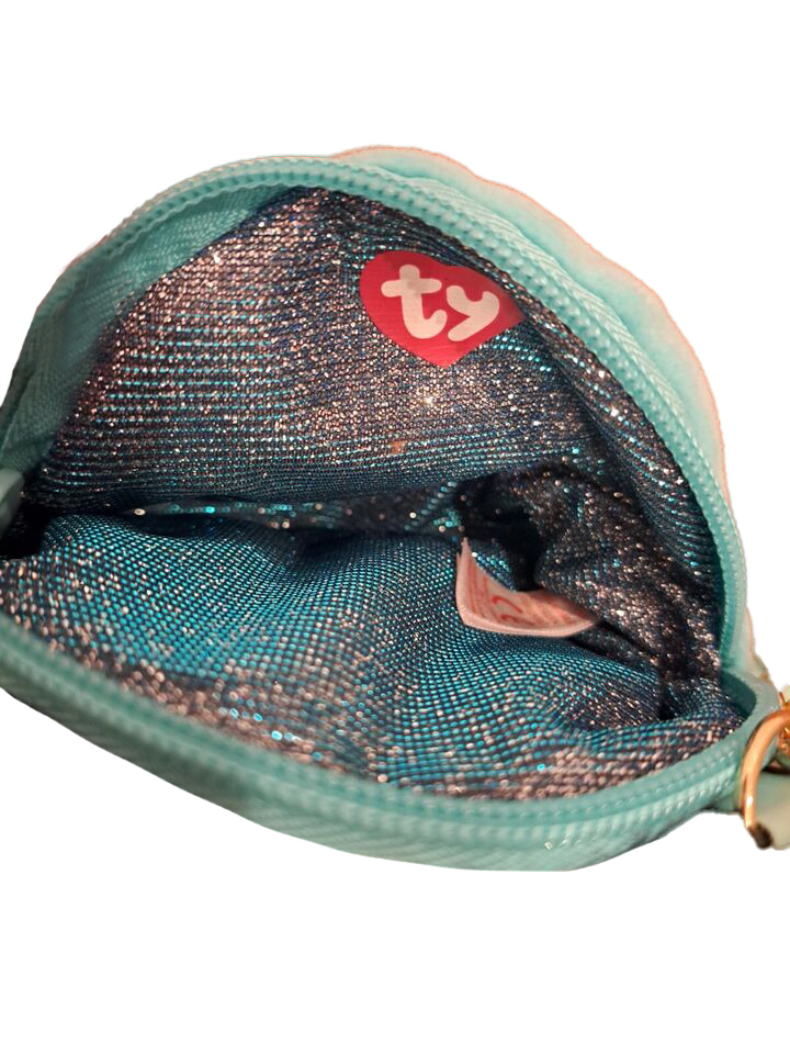 #Cute and useful Beanie Boo mini purses #Keeps small valuables safe and secure #Colorful and easy to find #Sparkly blue Glitter Eyes #Top-zip closure with Pom Pom Tassel pull #Includes official Ty Heart with birthday and poem #Surface clean only