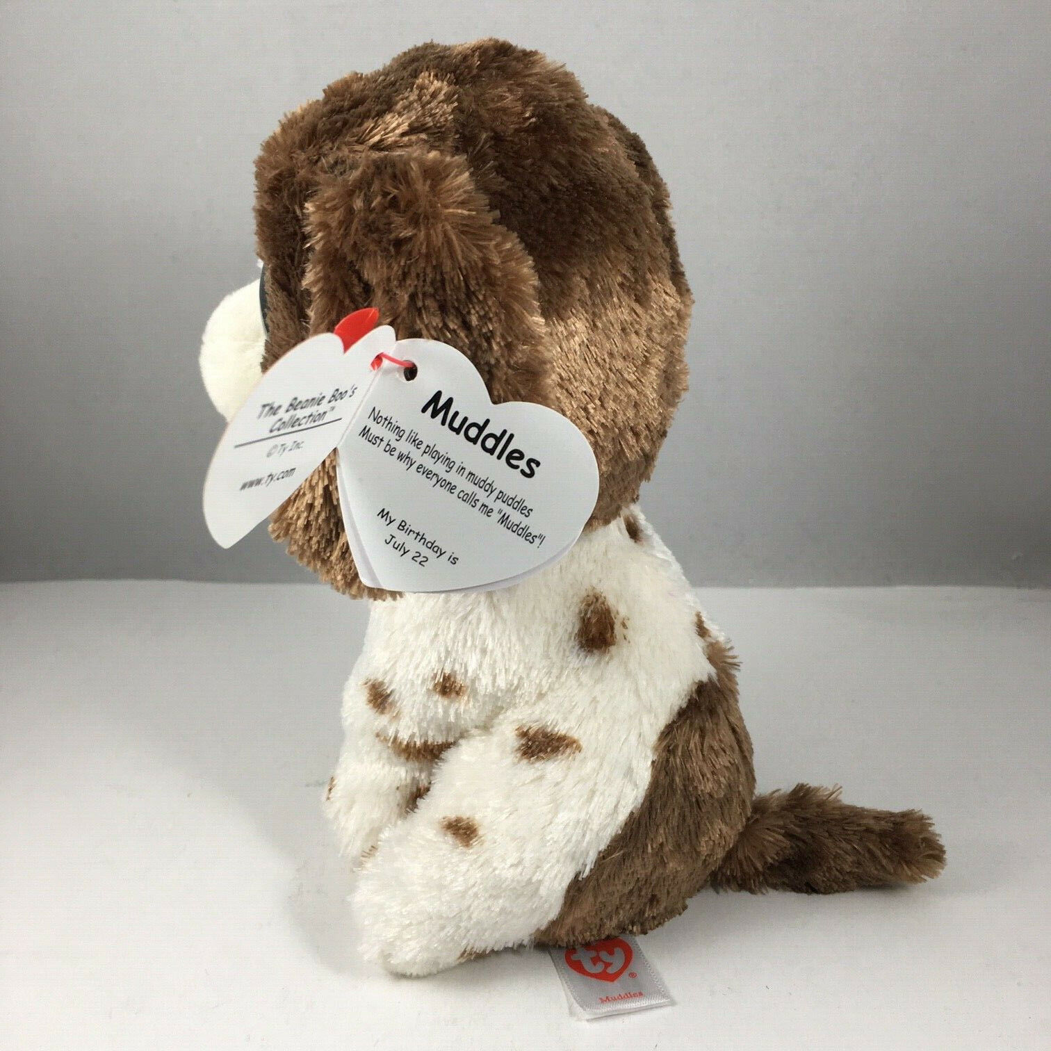 Muddles may look dirty. But, as a brown and white plush dog, Muddles is always ready to go with you.
