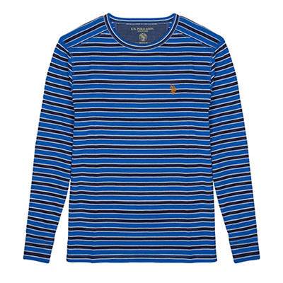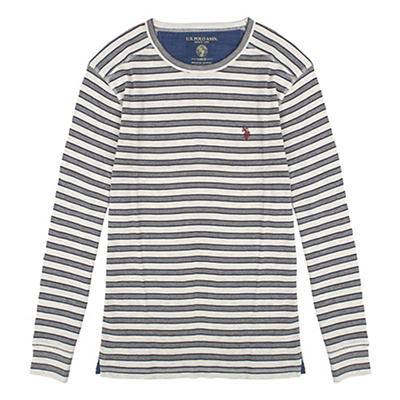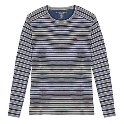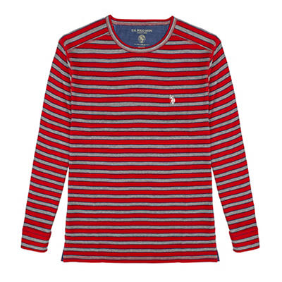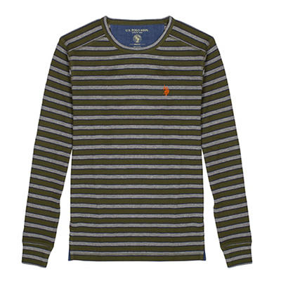 Comes in six color options: Gray Navy Stripe, Blue Navy Stripe, Oatmeal Health Gray Stripe, Red Gray Stripe, Burgundy Navy Stripe, and Green Gray Stripe Striped crewneck thermal with natural stretch