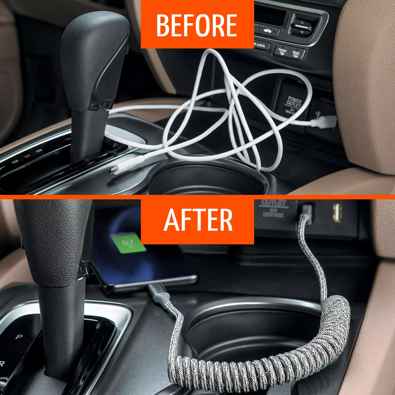 This chargesync helix cable is intelligently designed to clean-up your vehicle, so you won’t have to worry about the cord interfering with cup holders or storage, wrapping around your gear shift, or getting closed in your door.